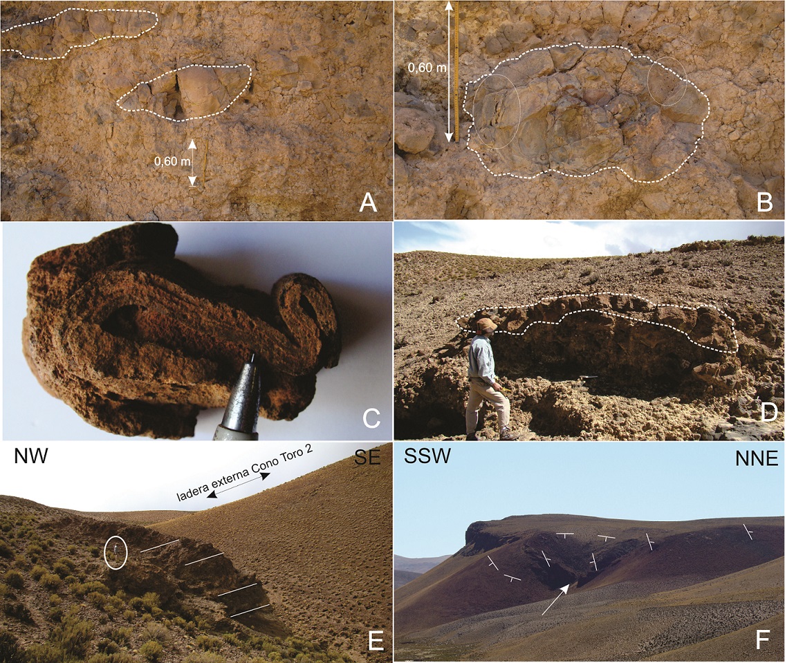 Fig. 6. A. Bombas fusiformes (contornos en línea de puntos) en depósitos de litofacies A del Cono Toro 2; B. Bomba globosa con diaclasamiento prismático, bordes densos y núcleo escasamente vesiculado (Cono Toro 2); C. Fragmento lapillítico (cinta) deformado dúctilmente en litofacies A (Cono Toro 2); D. Depósito lapillítico a brechoso de litofacies A cubierto por un gran fragmento de ‘spatter’ que se acomoda a la microtopografía subyacente (Cono Toro 2); E. Vista de la ladera SW del Cono Toro 2. Se reconoce una estratificación grosera buzante ~17° en dirección de la propia ladera del edificio volcánico (persona como escala); F. Orientación de los estratos del Cono Toro 1. La flecha indica el sector interno del cono de escorias que se caracteriza por la intercalación de depósitos lapillíticos brechosos sin soldar (litofacies A) y aglutinados (litofacies B). La flecha señala la ubicación donde se levantó la columna de la figura 7. |