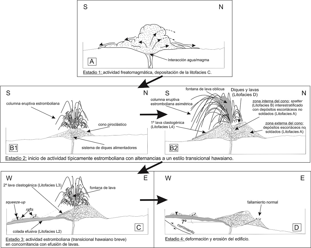 Inicio de la actividad típicamente estromboliana (litofacies A y D) y de la edificación del cono de escorias (Fig. 13B-1). La erupción habría alternado brevemente con un estilo transicional hawaiano por aumento en la velocidad de ascenso del magma (Parfitt, 2004), causando la erupción de fontanas de pequeña altura que generaron los depósitos piroclásticos aglutinados (litofacies B) intercalados con los escoriáceos de la litofacies A (Fig. 13B-2). De forma concomitante a la construcción del cono, se produjo la efusión de pequeñas coladas que fluyeron hacia el interior del cráter, movilizadas gravitacionalmente. La columna eruptiva tuvo, por momentos acotados, una componte oblicua que depositó al sur de la quebrada El Toro (Fig. 3A) tanto el material piroclástico no soldado (actividad estromboliana) como los depósitos aglutinados y lavas clastogénicas (durante erupciones transicionales hawaianas) que fluyeron hacia el sur, sobre la ladera del propio cono de escorias (Fig. 13B-2). El desarrollo de una columna eruptiva oblicua habría generado una distribución algo asimétrica de los depósitos ahora erosionados y disectados por el río, con cobertura areal mayor hacia el sur de la quebrada El Toro, y mayor espesor de los depósitos hacia el norte, donde se localizaba el conducto principal.