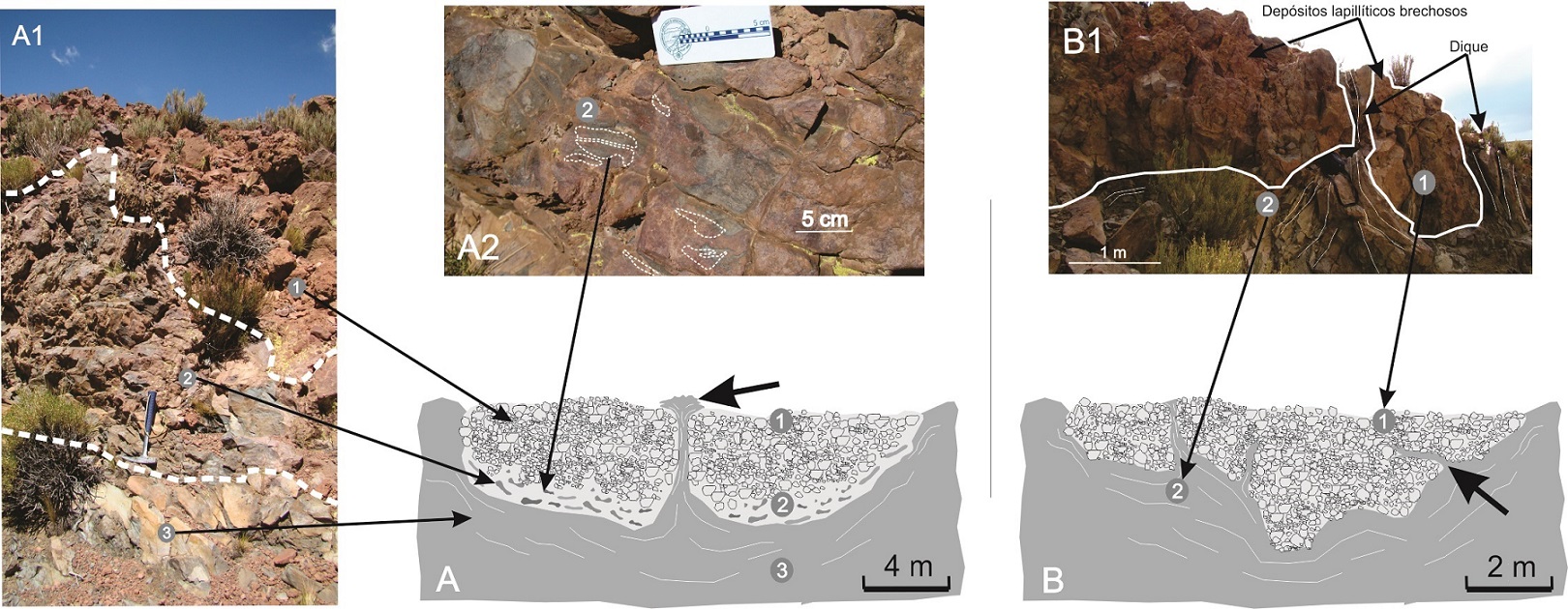 En el tope de algunas de las coladas de lava se hallan bloques y montículos de coloración rojiza, conformados mayormente por depósitos semejantes a los de la litofacies A predominante en los conos de escoria (Fig. 11). Algunos bloques son macizos, mientras que en otros se reconoce una estratificación gruesa y poco definida, con alternancia de niveles lapillíticos y brechosos, en algunos casos con diferencias en el grado de endurecimiento y soldamiento de las distintas capas. Estos bloques y montículos poseen dimensiones entre 1 a 20 m de largo, espesores entre 1 a 10 m y volúmenes de entre ~1 m3 y varias decenas de metros cúbicos. Los montículos se encuentran parcialmente hundidos dentro de la colada que los subyace, la cual desarrolla en su contacto una foliación que se orienta alrededor de los primeros (Fig. 11). En algunos casos presentan diques subhorizontales a subverticales con espesores de 0,20 a 2 m (Figs. 10B y 11) que, alimentados desde las lavas, se proyectan dentro de los montículos y bloques piroclásticos intruyéndolos parcial o totalmente. Dependiendo del centro eruptivo que se trate, estos diques tienen texturas foliadas coherentes (Conos Toro 1 y 2) o bien de aspecto interno eutaxítico (Cono Toro 1, Fig. 10C). A veces, en sus márgenes o entre fragmentos de un mismo montículo, presentan sobreelevaciones o espinas de lava foliada con forma de flor o abanico (Fig. 10B y 11A).