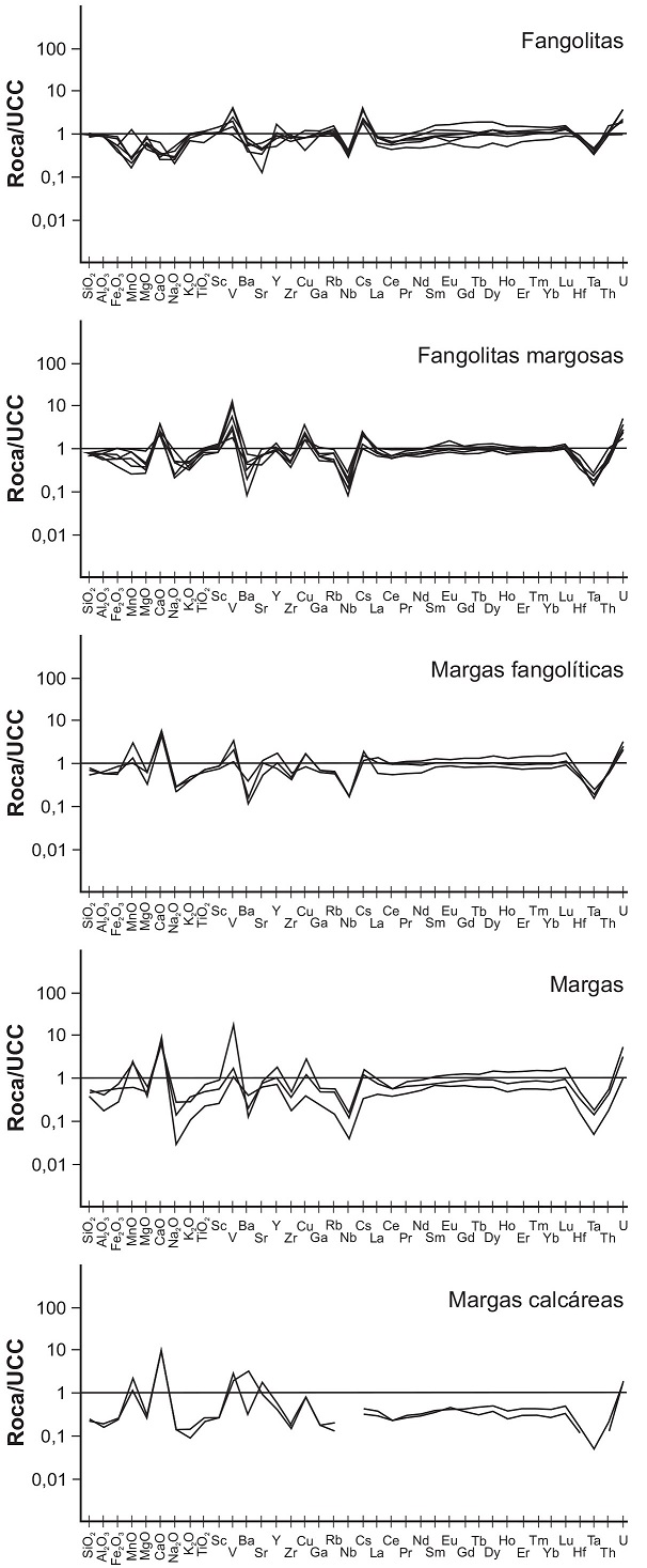 La comparación entre la composición de las sedimentitas estudiadas y la composición media de la corteza continental superior (Taylor y McLennan, 1985) permite apreciar que las de la Formación Vaca Muerta exhibe mayores valores comparativos en V y U, en tanto que el Na2O, Ba, Nb y Ta aparecen con contenidos menores que la media de la corteza continental superior (Fig. 9). Además, las fangolitas también muestran incremento de Cs y menores contenidos de MnO, CaO y Sr (Fig. 9). A medida que aumenta la proporción de carbonatos de calcio en las rocas estudiadas se aprecia decrecimiento en los valores comparativos de K2O y Zr; también se registra -como se señalara anteriormente- una paulatina depresión en las tierras raras (Fig. 9).