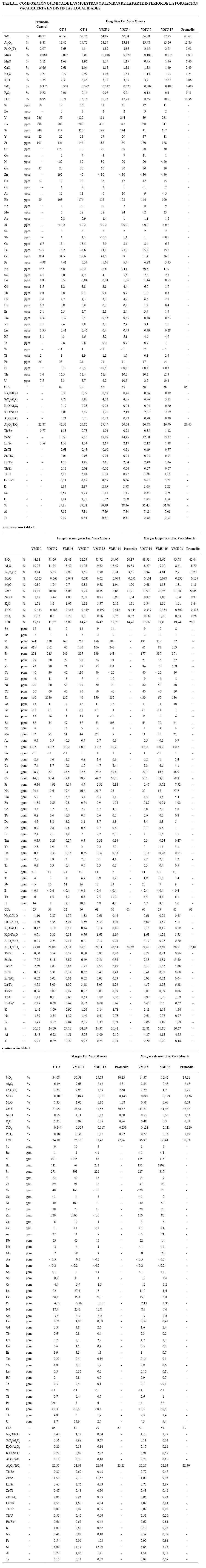 Para el estudio geoquímico inorgánico las 20 muestras fueron limpiadas, eliminándose las porciones meteorizadas y las venas epigenéticas, y molidas a trozos < 4 mm en mortero de ágata. En ese estado fueron remitidas a Actlabs (Canadá) donde fueron pulverizadas y analizadas con técnicas estándar IC-MS; detalles en http://www.actlabs.com, para obtener el contenido de 10 elementos mayoritarios (Si, Ti, Al, Fe, Mg, Mn, Na, K, Ca y P) expresados como porcentaje de óxidos y 45 elementos traza expresados en ppm.