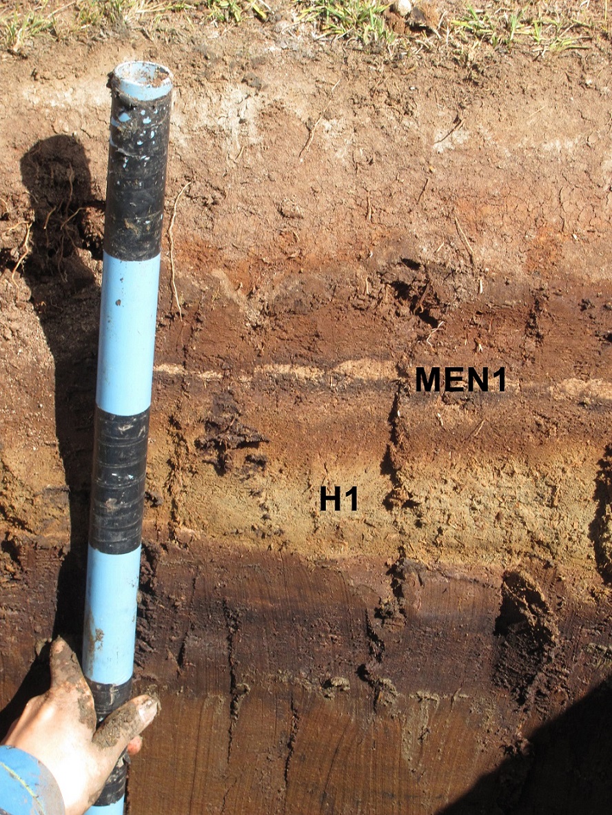 Fig. 4. Photo of 2 cm thick Mentolat MEN1 tephra (sample PC14-01-46) and 10 cm thick H1 tephra (PC14-01-44) from a pit ~30 km southeast of Cochrane (Fig. 2; Table 1). Each blue and black band on the pole are 10 cm in length.