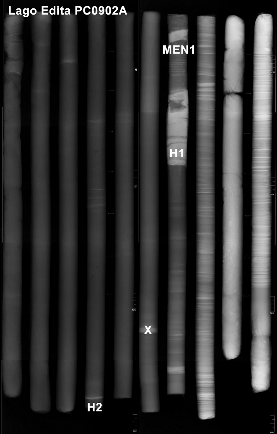 Fig. 5. X-ray image of ~10 meter long core PC0902A from Lago Edita (Fig. 2), showing bright white relatively high density H1, H2 and MEN1 tephra layers within darker lower density organic-rich lacustrine sediments. Core is divided into 10 segments each approximately 1 meter long. Bright bands are dense layers which include tephra H2 in segment #4 and MEN1 and H1 in segment #7. H1 tephra is ~14 cm thick, MEN1 ~3 cm thick and H2 only ~1 cm. Higher density (brighter) laminated material in the deeper part of the core (segments #8-10) below H1 and MEN1 is glacial-lacustrine clay, silt and sand. Bright band marked with X in segment #6 is also sand, not tephra.