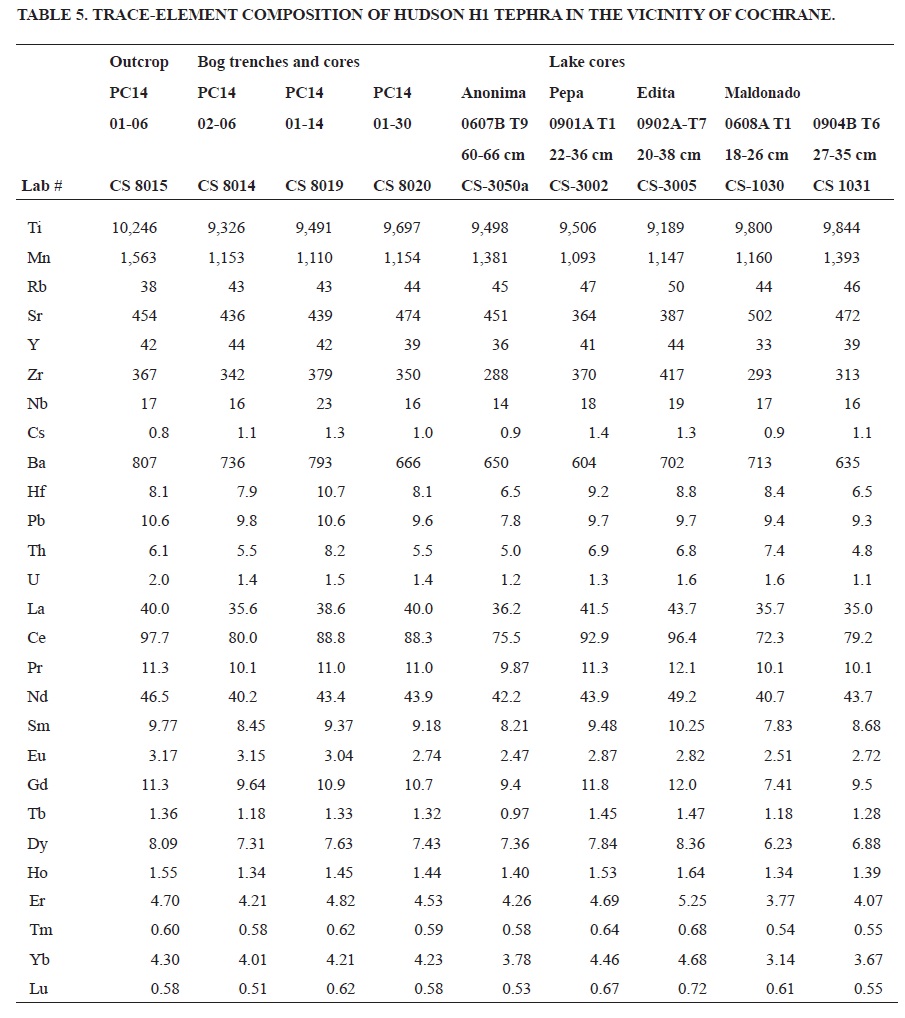 Thin (<2 cm) Late Holocene tephra layers occur in some of the cores, but not in any of the trenches or outcrops. These are petrologically somewhat similar to H1 tephra, with plagioclase and pyroxene phenocrysts and brown glass with stretched vesicles, although the glass has a lighter color than H1 tephra glass. Bulk tephra also has higher Rb, Ba, Zr, La and Yb, but lower Ti contents than H1 tephra (Table 7; Fig. 8). Their late Holocene age, as indicated by their location relative to H1 tephra in the cores, and their chemistry and thickness is consistent with this tephra being a distal layer of the Hudson H2 eruption at approximately 4000 cal yrs BP (Naranjo and Stern, 1998).