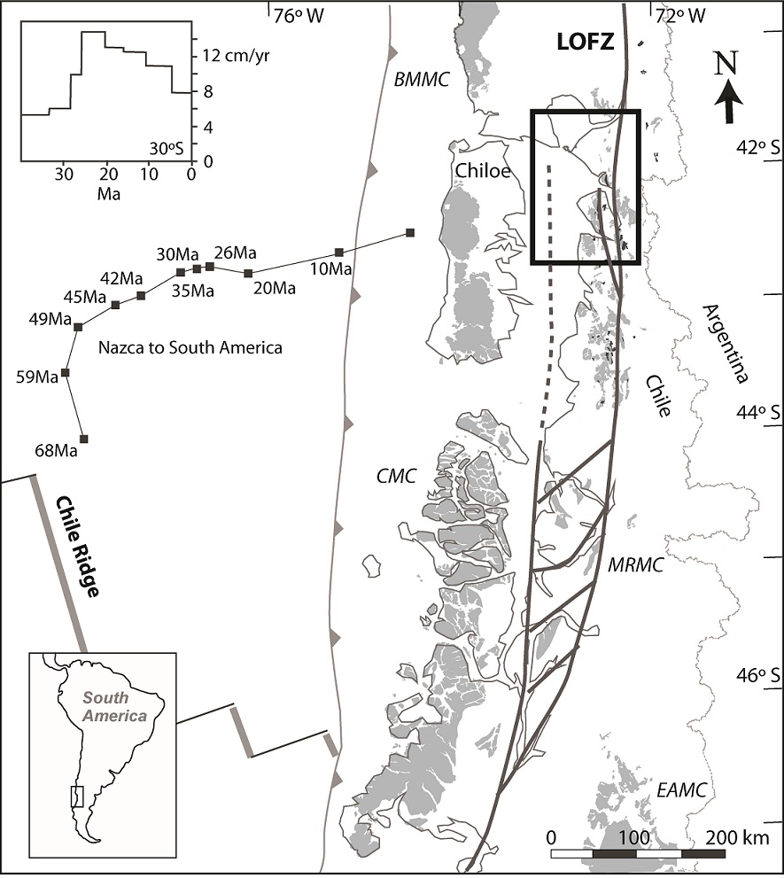 Fig. 1. Geological sketch map of the studied area, after Encinas et al. (2013), with the study area outlined by the rectangle. Outcrop areas of supposed basement rocks are shaded. Acronyms refer to: BMMC (Bahía Mansa metamorphic complex), CMC (Chonos metamorphic complex), MRMC (Main Range metamorphic complex) and EAMC (Eastern Andes metamorphic complex). The main faults in the Liquiñe-Ofqui fault zone (LOFZ) are indicated, as well as the position of a point in the Nazca plate relative to the continent through Cenozoic time (relative approach velocity shown in the the top left-hand graphic), after Cande and Leslie (1986). |