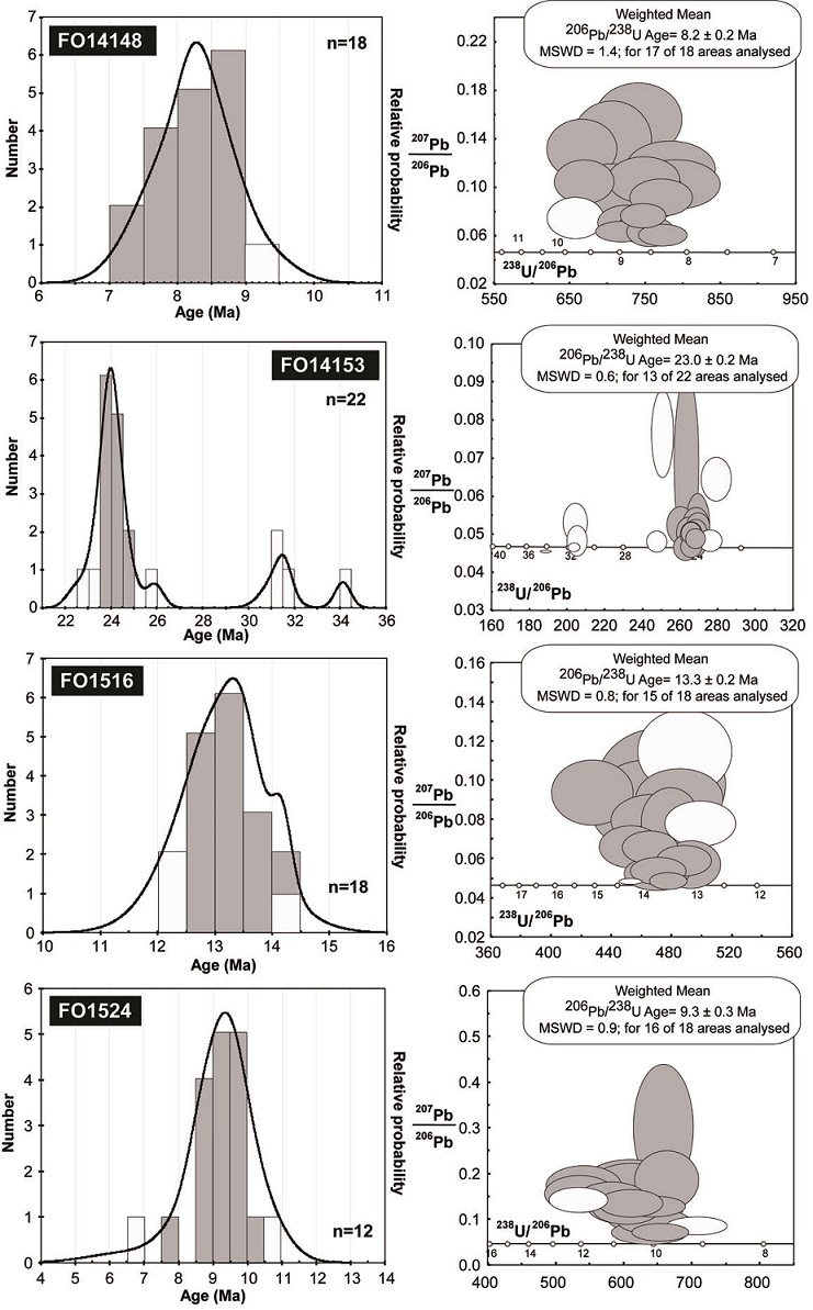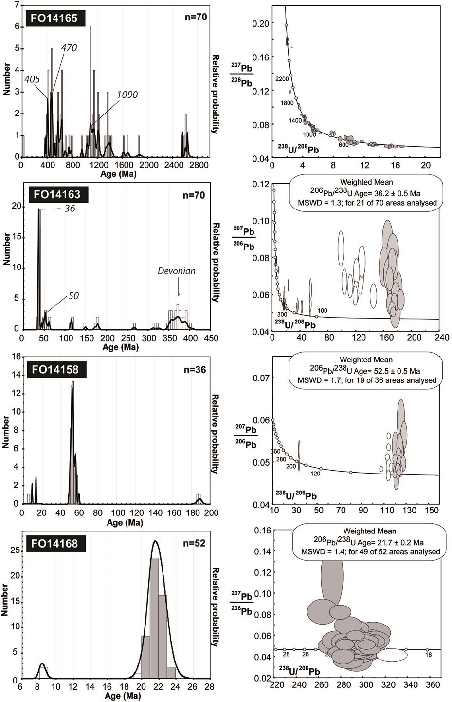 FO14168 is a fine-grained tuffaceous sandstone from north of Buill belonging to the Ayacara Formation. It has a homogeneous population of euhedral zircon crystals, with pyramidal terminations and prominent central cavities consistent with a volcanic paragenesis; the internal CL structure showing broad to weak zoning is also common to volcanic zircon. Forty nine of the 52 grains analysed (Fig. 4) have an early Miocene weighted mean 206Pb/238U age of 21.7±0.2 Ma (MSWD=1.4), in accordance with the age assigned to this unit by Encinas et al. (2013).