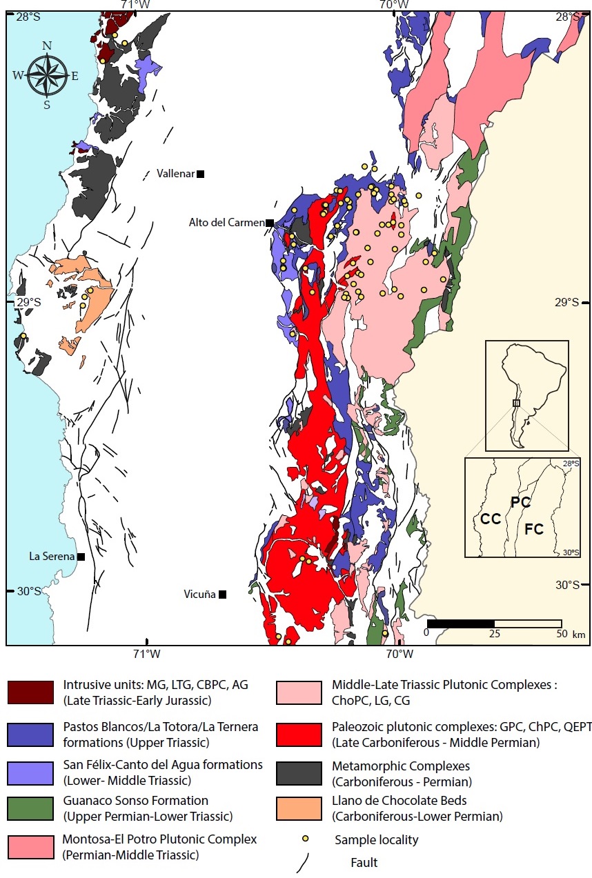 The Triassic magmatism at the present-day Coastal and Frontal Cordilleras between 28°00’ and 29°30’ S is mainly represented by plutonic units comprising tonalitic to monzogranite rocks, with scarce syenogranites and more basic rocks such as gabbro and diorite, of which the Chollay Plutonic Complex is the volumetrically most important. Volcanic sequences are more restricted but not uncommon, and they are composed of rocks ranging from basalt to rhyolite, being more abundant the differentiated rocks.