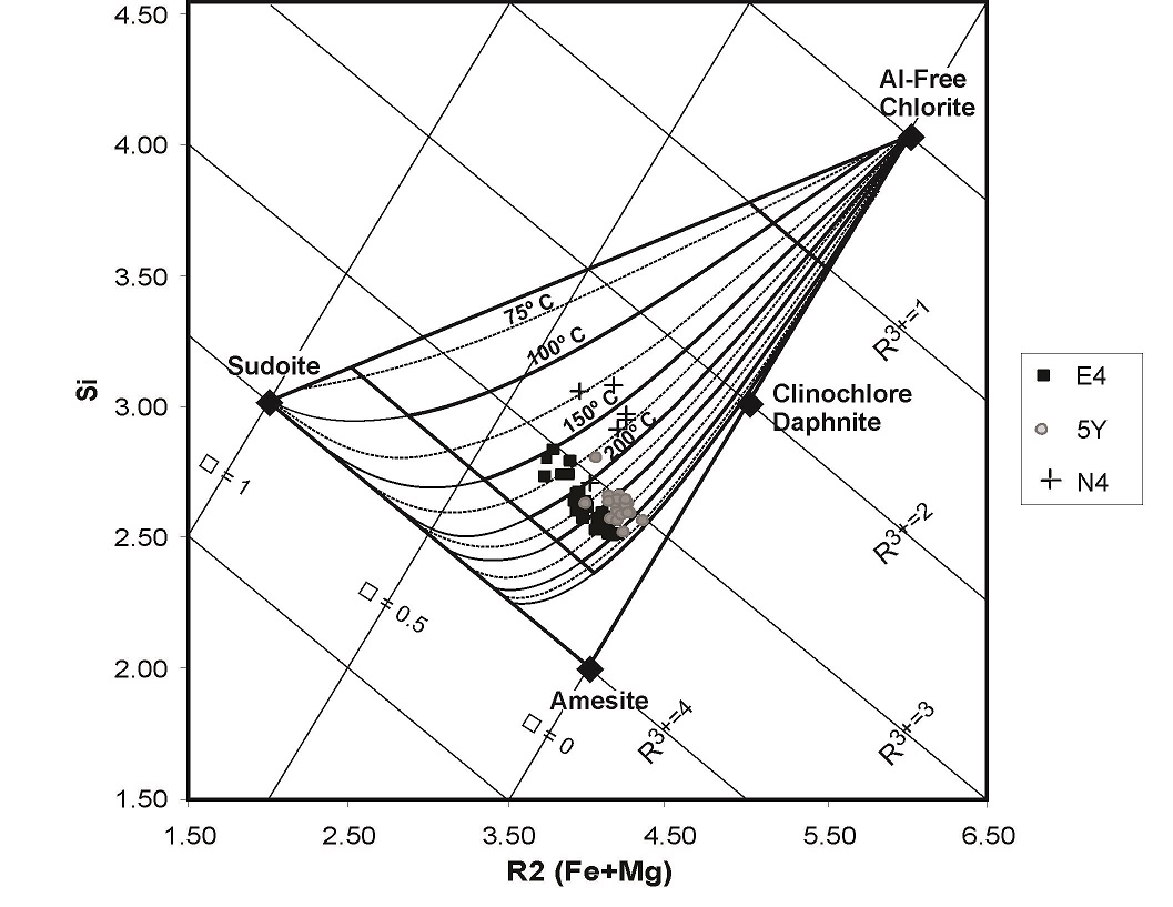 Bourdelle, F.; Cathelineau, M. 2015. Low-temperature chlorite geothermometry: a graphical representation based on a T-R2+-Si diagram. European Journal of Mineralogy 27: 617-626.