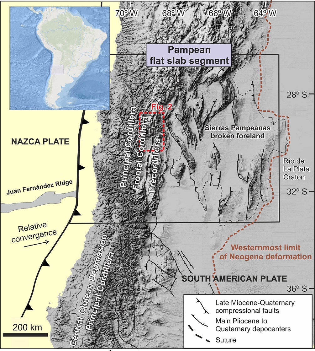 FIG. 1. Tectonic framework of the Southern Central Andes and main morphotectonic features of the present-day Pampean flat-slab subduction segment. A compressive regime associated with flat-slab segment is responsible for the uplifting of the Sierras Pampeanas (modified from Litvak et al., 2015). Precordillera and Cordillera Frontal suture is based on Ramos (1988). Dashed square indicates mapped area of figure 2.