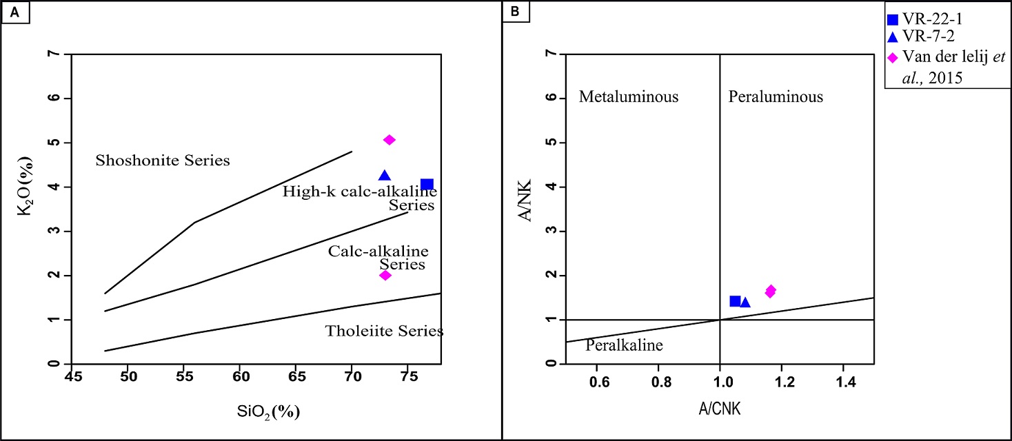 La composición química del neis cuarzo-feldes-pático con biotita y hornblenda (muestra VR-7-2) y neis cuarzo-feldespático con biotita y muscovita (VR-22-1) se muestra en la tabla 1. Las rocas estudiadas pertenecen a la serie calcoalcalina rica en potasio según Peccerillo y Taylor, 1976 (Fig. 4A), excepto una, que es calcoalcalina normal. El índice de saturación en alumina de Shand (1943), basado en la relación Al2O3/(CaO+Na2O+K2O) con valores entre 1,47 y 1,49, indican el carácter peraluminoso de estos ortoneises (Fig. 4B).