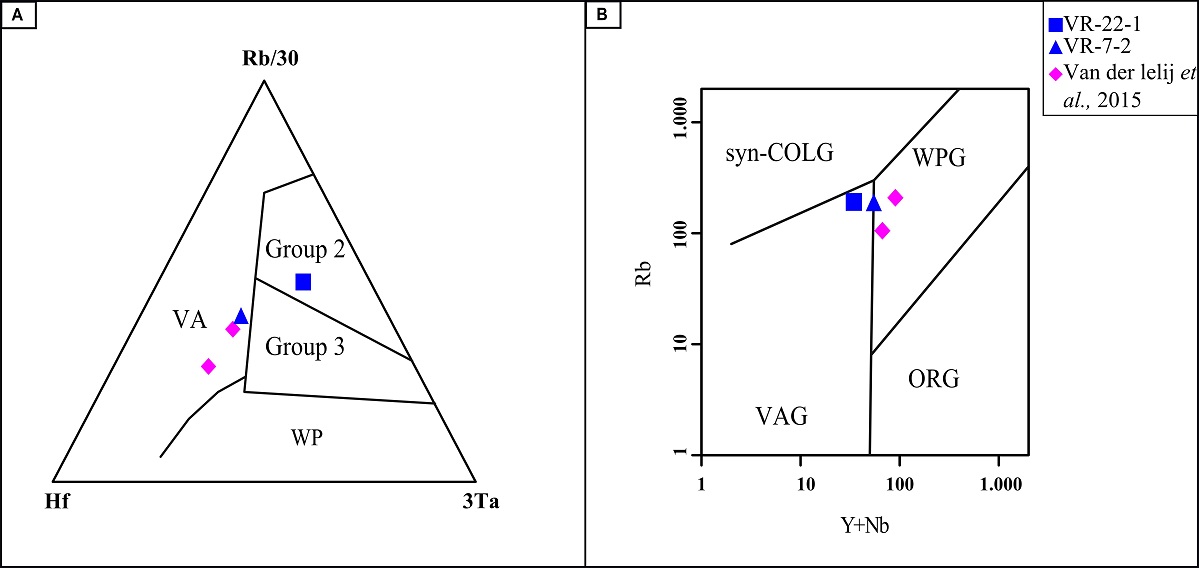 El diagrama de los elementos de las tierras raras (REE por sus siglas en inglés) normalizado a la corteza superior (Taylor and McLennan, 1981), de forma general, muestra un patrón de empobrecimiento en tierras raras livianas respecto a las tierras raras pesadas, este patrón, es más notorio en la muestra VR-22-1, la cual a su vez se encuentra más empobrecida en su contenido total de REE respecto a la muestra VR-7-2, ambas con anomalías negativas de Europio. Los valores de fraccionamiento son: La/Yb de 0,35 y 0,57, La/Sm de 0,75 y 0,81, Gd/Yb de 0,55 y 0,93 para las muestras VR-22-1 y VR-7-2 respectivamente. El diagrama spider normalizado también a la corteza superior (Taylor y McLennan, 1985) muestra enriquecimientos en Th, K, Nd, Sm, Y, La, Yb y empobrecimiento en Ba, Nb, Sr, Tb (Fig. 5A y B).