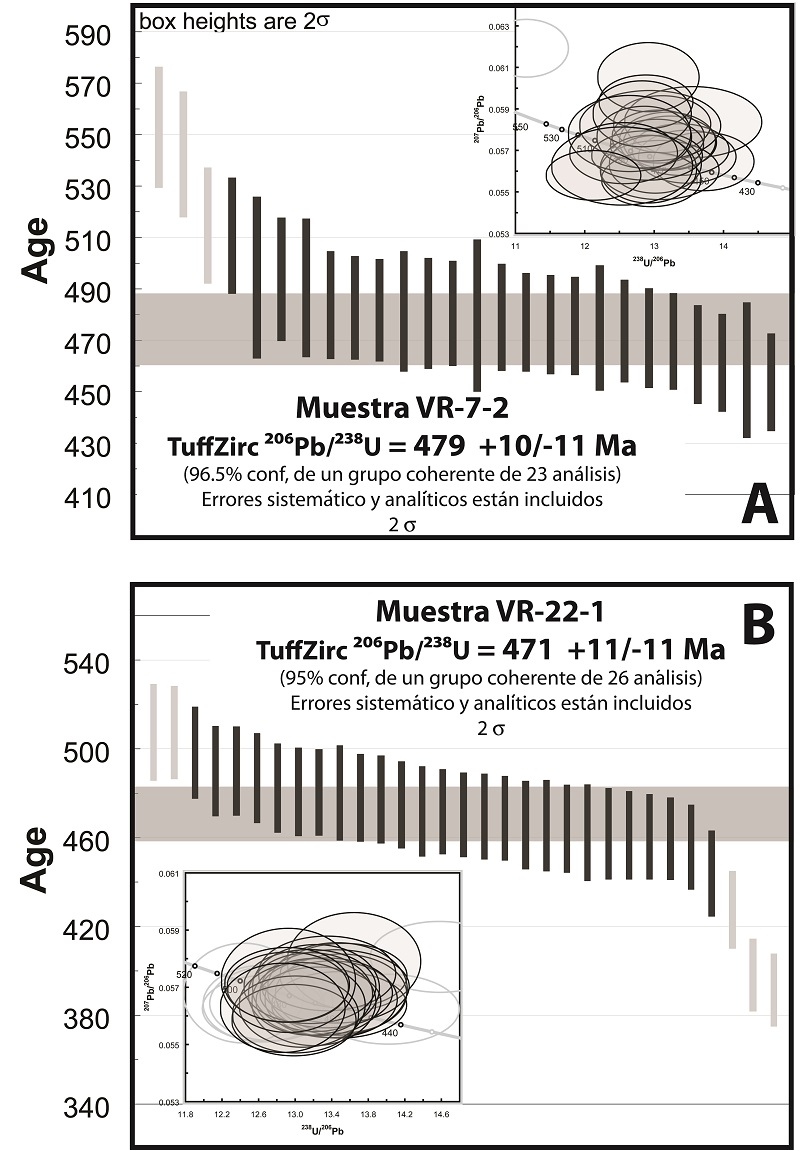 FIG 10. Diagramas concordia U-Pb en circones del Ortoneis. A. Muestra VR-7-2. B. Muestra VR-22-1. |