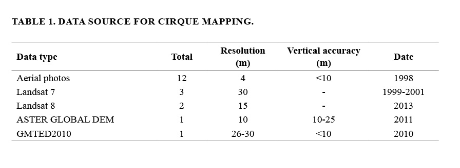 Each cirque was digitized as a closed polygon with a unique ID number, upon which a table containing associated morphometric information was generated. Calculations of planimetric and hypsometric indices (Křížek et al., 2012) were conducted using the open source software Quantum GIS 2.2 and GRASS 6.0. The calculation of variables such as length and width of the cirques was performed in ArcView 3.2.