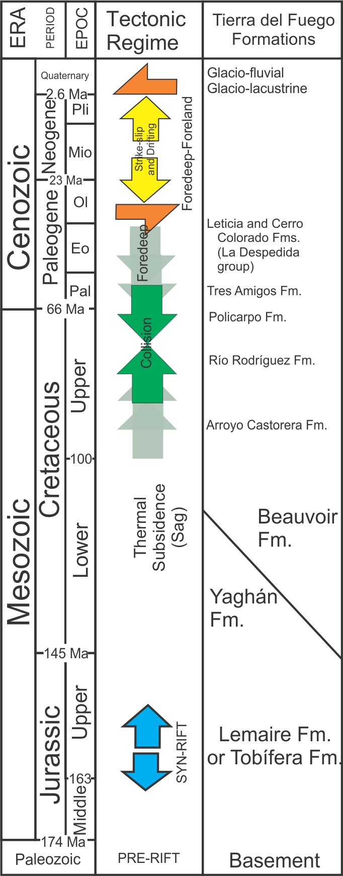 The central part of the Tierra del Fuego island, north of Lago Fagnano, includes a succession of Lower Cretaceous to Eocene units exposed along WNW-ESE oriented belts (Fig. 3; Malumián and Olivero, 2006; Olivero and Malumián, 2008; Martinioni et al., 2013). The Lower Cretaceous Beauvoir Formation exposed along the northern margin of Lago Fagnano, part of the back-arc basin-fill of the former Rocas Verdes marginal basin, is composed of slates, mudstones and minor sandstones of hemipelagic deep-marine environment. The Upper Cretaceous, which includes Arroyo Castorera, Río Rodríguez and Policarpo formations, is mudstone-dominated, with an upward increase in coarse sand material and represents the transition to the Late Cretaceous Austral foreland basin evolution. This transition is interpreted as turbiditic deposits that were progressively accumulated in front of the rising Fuegian Andes (Martinioni et al., 2013). The Paleocene Tres Amigos Formation (Cerro Apen Beds in Martinioni et al., 2013) consists of conglomerates, sandstones and siltstones from fan delta deposits. The Leticia and Cerro Colorado formations (both from Eocene of La Despedida Group) crops out in the northeast. These formations consist of mudstones and sandstones from a coastal and estuarine environment.