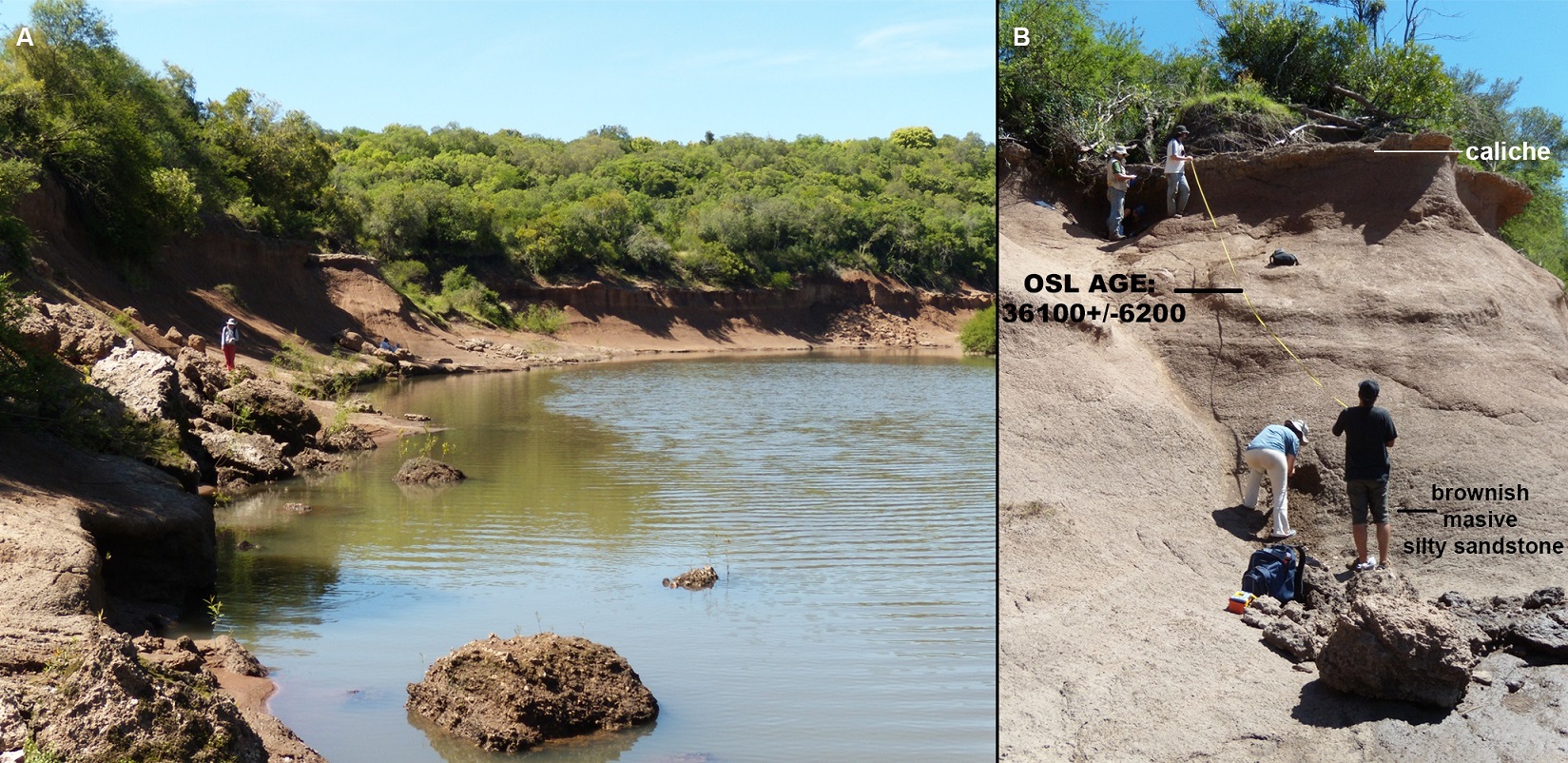 Fig. 2. A. Panoramic view of one of the outcrops of the Sopas Formation on the Cuareim River (Artigas Dapartment, Uruguay); B. Detail of the stratigraphic section from where the new N. recens material described in this work comes from. OSL AGE in years (Optically Stimulate Luminescence Age) from Ubilla et al. (2016).