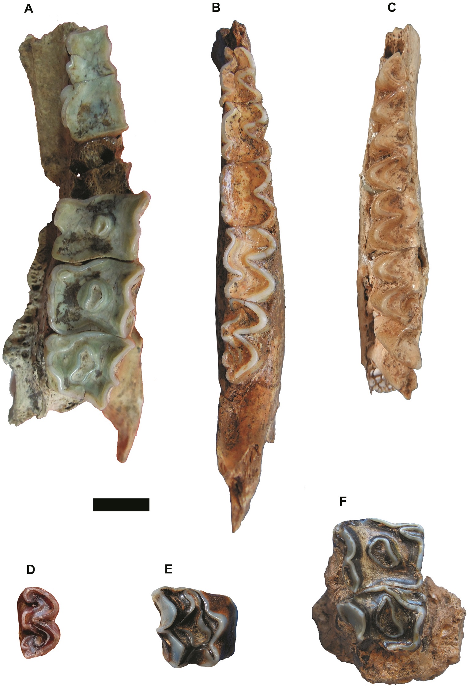 The following set of anatomical features allow assigning this material to N. recens: infraorbital foramen located at the P4 level; P4-M3 with a very well developed anterolingual cingulae; cementum covering the lateral walls of P4-M3, central valleys, and part of the occlusal surface; metaconule reduced to a small transverse crest connecting the hypocone to the metacone (Fig. 3).