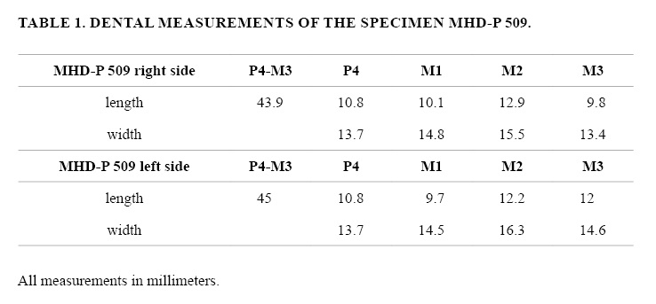 The teeth of MHD-P 509 are similar in form and size to those described by Ubilla et al. (2011). The series P4-M3 is 45 mm in length, with all teeth wider than length. The anterior lingual cingulum is developed in P4-M3 and filled with cementum. P4 and M1 have the highest degree of wearing, being the cusps rounded to blunt in shape. The inner cementum is lost and the dentine is exposed. M1-M3 show variable development of the paracone and metacone folds. M2 is the largest tooth, subquadrangular, with rounded to sharp cusps. The cementum is coating the molars externally, especially M2 and M3 still preserving the inner cementum. In these teeth, the paracone and metacone are the most developed cusps, the postcíngulum is sharp and the hypocone is especially reduced in M3. As in the specimen MACN-S 92 the M1-M3 metaconules are reduced as a slight crest. The quantitative comparison of MHD-P 509 with the specimens MACN-S 92 and FC-DPV 749 show that they are closely similar, being the M1 and M2 the less variable teeth, respect to size.