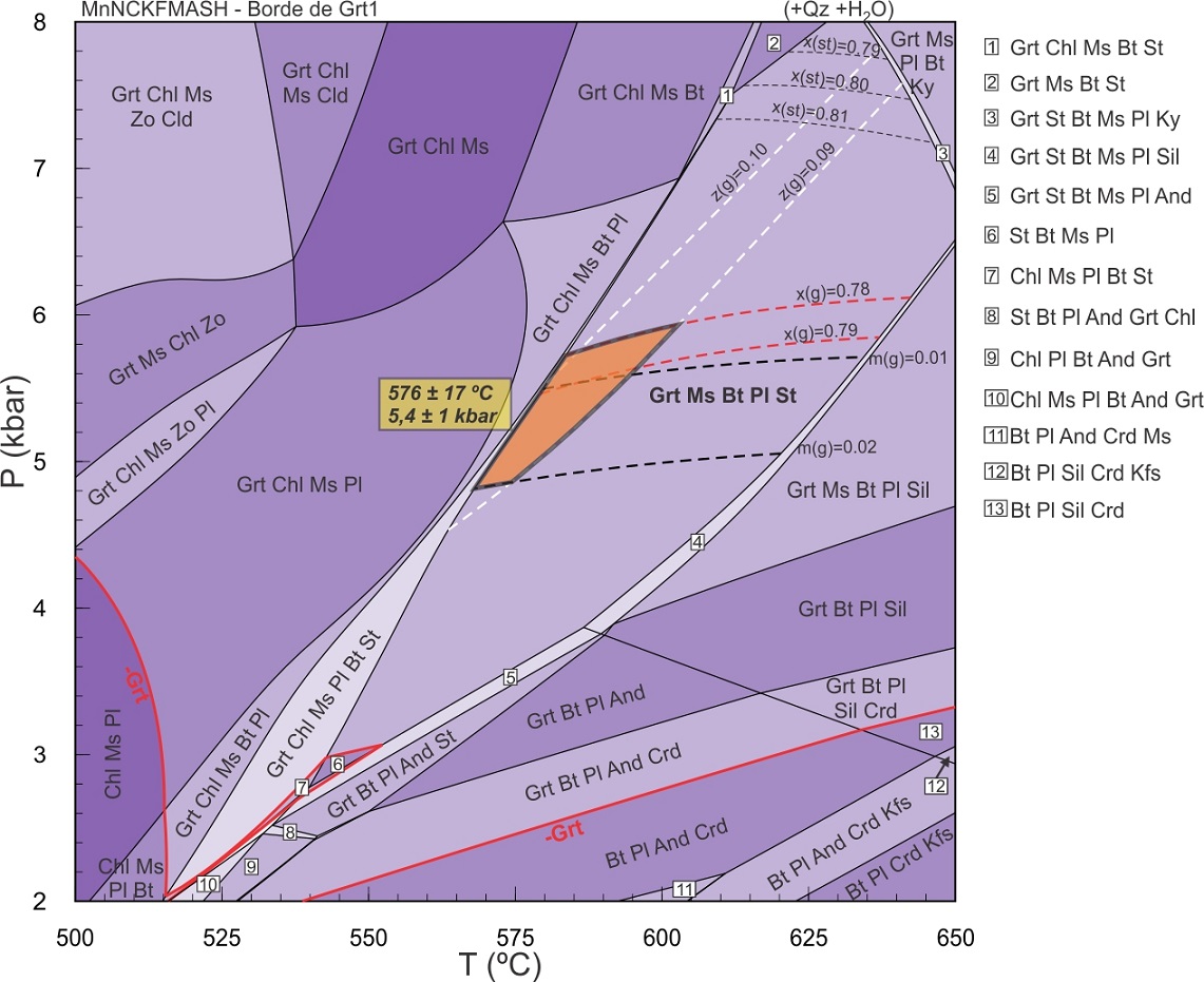 Esta pseudosección se elaboró en el sistema MnNCKFMASH (MnO-Na2O-CaO-K2O-FeO-MgO-Al2O3-Si2O-H2O) y corresponde al momento en el que el Grt1 comienza a formarse (núcleo). En dicho momento, todos los elementos químicos habrían estado disponibles para reaccionar y es por esto que en el cálculo de la pseudosección se considera como composición efectiva a la composición global de la roca (Tabla 1). Dado que las condiciones bajo las cuales se habrían producido las reacciones serían subsólidas, se consideró un sistema saturado en H2O (5%) para el rango P-T analizado.
