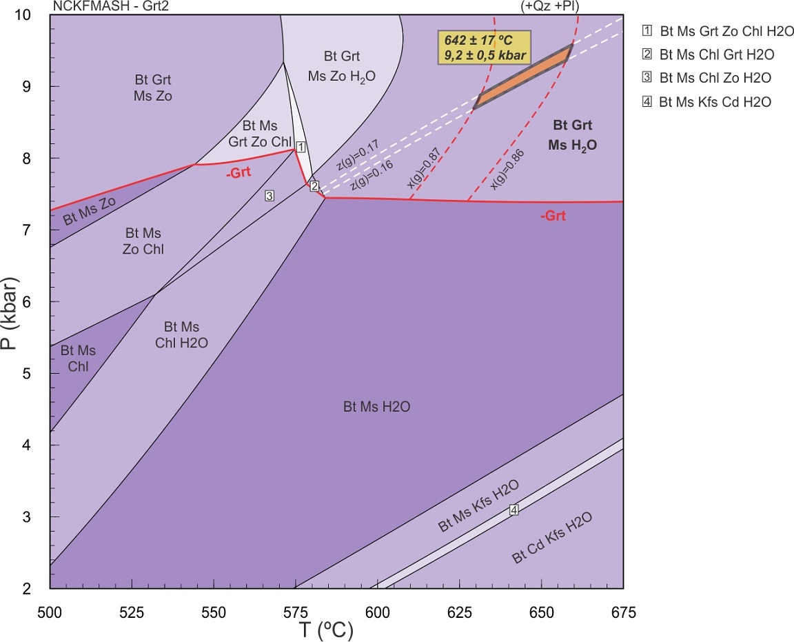 Para estimar las condiciones de equilibrio de esta etapa se utilizan las isopletas calculadas para la composición de Grt2, las cuales se intersectan en el campo con Grt+Bt+Ms+Pl+Qz+H2O y arrojan valores de 9,2±0,5 kbar y 642±17 ºC.