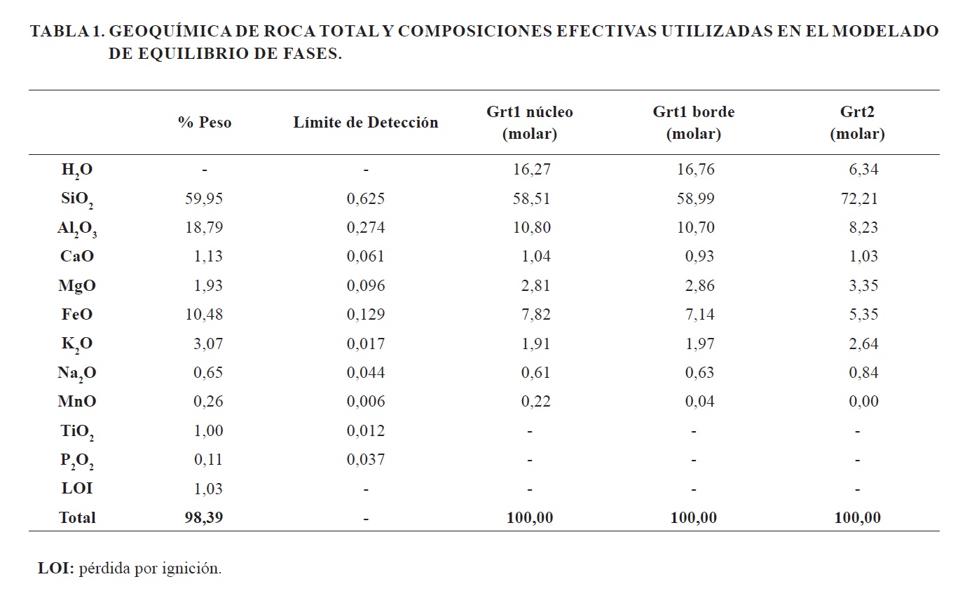 La geoquímica de roca total de la muestra de esquisto estaurolítico (SPP-27002) fue tomada de Ramacciotti et al. (2015b). Los resultados se muestran en la tabla 1, junto con las composiciones químicas efectivas calculadas y utilizadas en el modelado (ver abajo). La composición química de la muestra SPP-27002 corresponde a una pelita de acuerdo con el diagrama de clasificación de rocas sedimentarias de Herron (1988) con SiO2 = 59,95%, Al2O3 = 18,79% y FeO/MgO = 5,42 (Ramacciotti et al., 2015b).