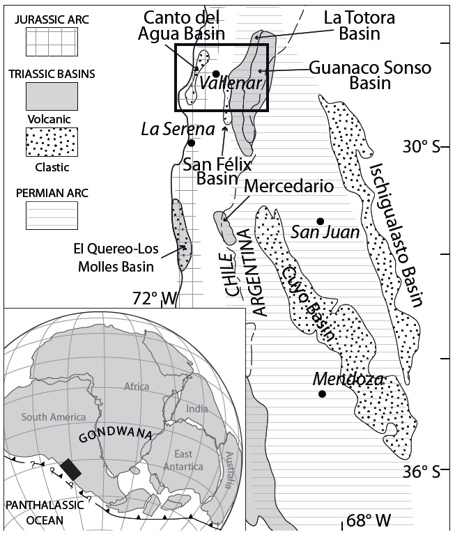 Suárez, M.; Bell, C.M. 1992. Triassic rift-related sedimentary basins in northern Chile (24-29° S). Journal of South American Earth Sciences 6 (3): 109-121.
