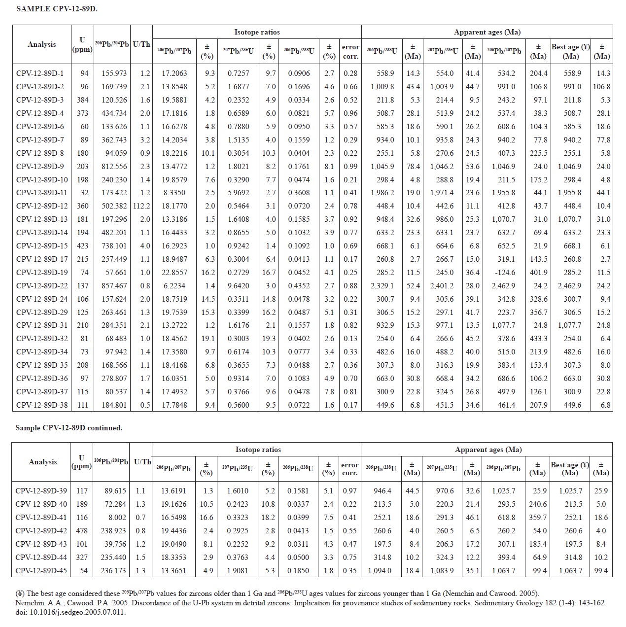 A sandstone from the bottom of the type locality section (CPV-12-88X) yielded five unmixed Permian-Carboniferous age peaks (n=94): 264.5±5.3, 280.2±5.3, 290.4±4.4, 303.2±3.2 and 331.3±12 Ma (Fig. 7), and four dispersed zircons between 450 and 500 Ma.