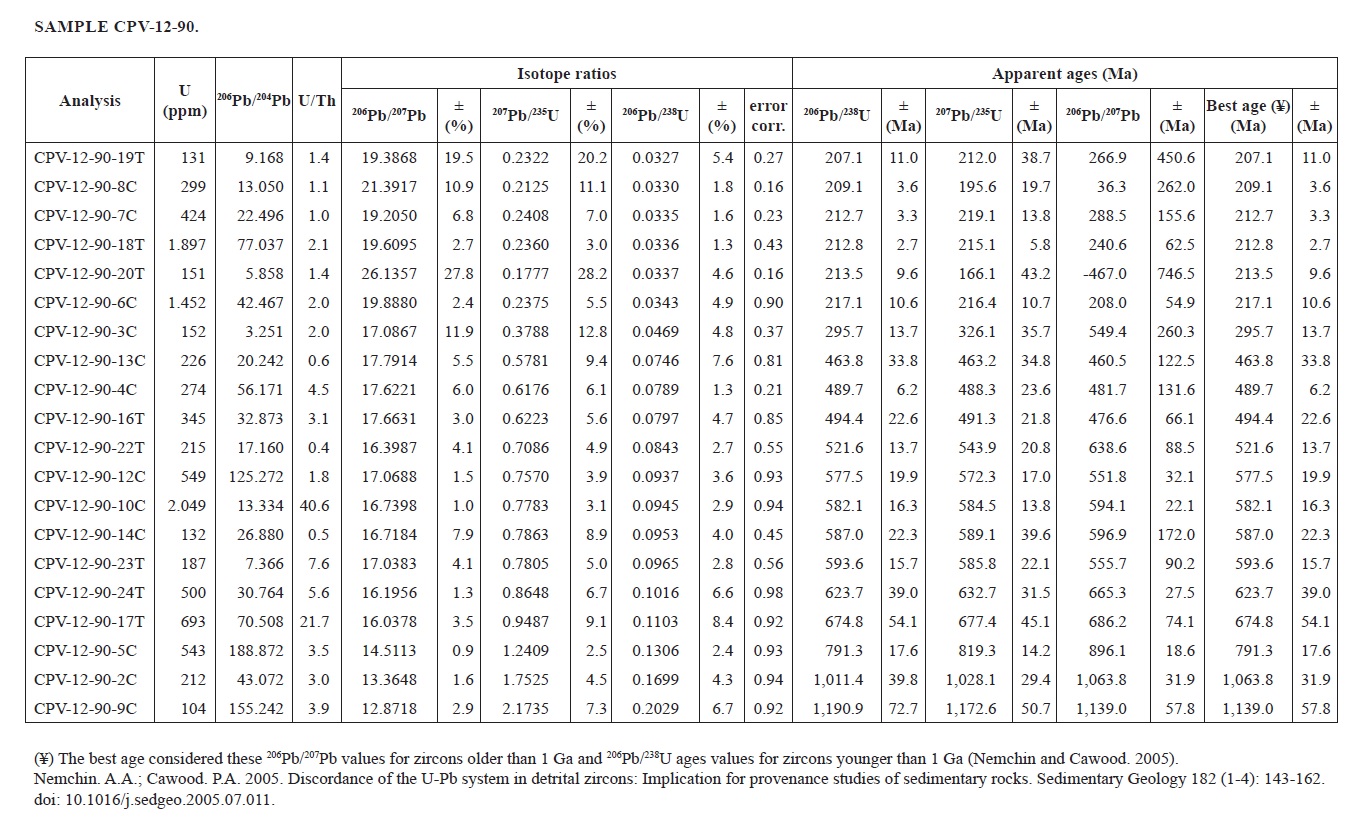 Zircon age distribution (n=20) from an arkose of the middle section (CPV-12-90) show well-defined peaks of 211.9±3.4 Ma, 494.3±11.0 and 585.7±18.0 Ma (Fig. 7). At the top of the type section (CPV-12-89D), the U-Pb age populations (n=33) from an arkose are 212.8±7.3, 259.4±4.0, 299.8±7.0, 454.7±5.6, 665.8±5.8 and 1,050.5±13.0 Ma (Fig. 7). A litharenite from the El Molle mine section (CPV-12-113b) shows well-defined peaks (n=95) at 216.4±2.4 Ma, 224.3±1.1, 252.5±0.8, 268.7±2.2, 294.8±2.0 and 331.4±2.5 Ma (Fig. 7).