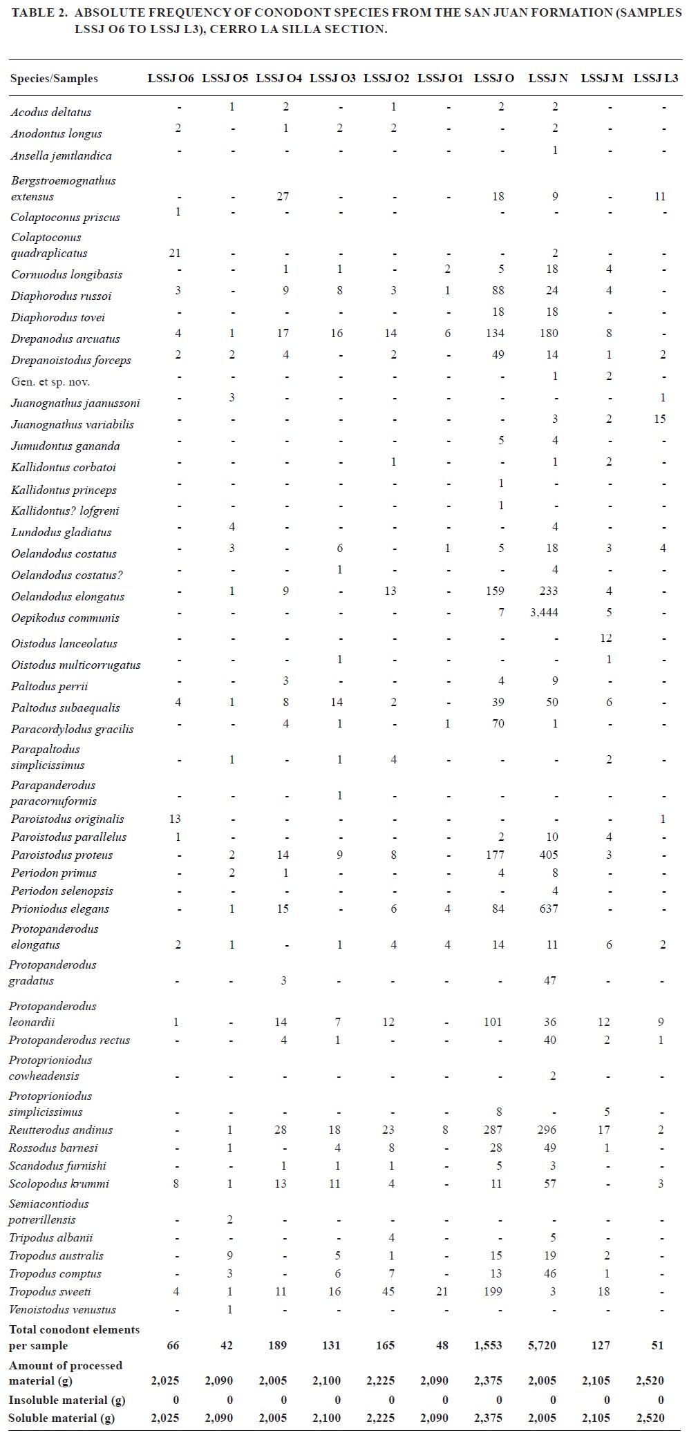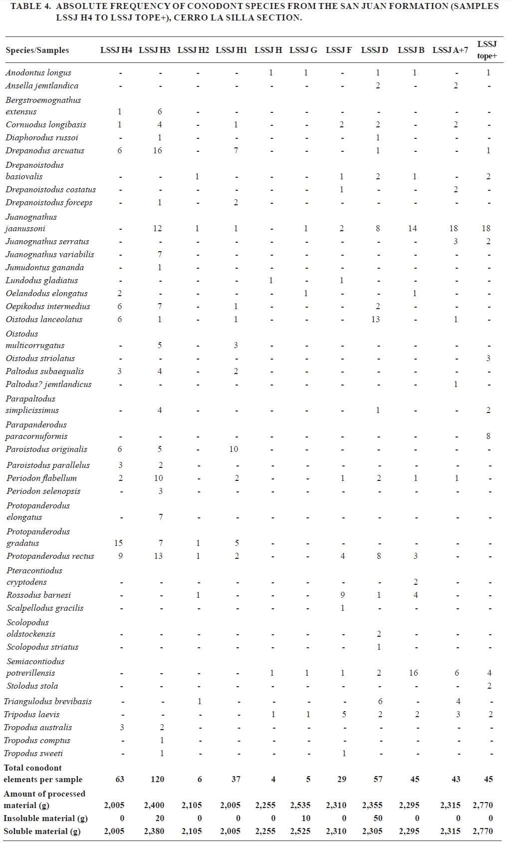 These samples yield a high diversity and abundance of conodonts, with the record of Juanognathus jaanussoni Serpagli, Semiacontiodus potrerillensis Albanesi, Parapaltodus simplicissimus Stouge, Oelandodus elongatus (Lindström), Rossodus barnesi Albanesi, Reutterodus andinus Serpagli, Tropodus australis (Serpagli), Oelandodus costatus van Wamel, Bergtroemognathus extensus Serpagli, Acodus deltatus (Lindström), Periodon primus Stouge and Bagnoli, Ansella jemtlandica (Löfgren), Oistodus lanceolatus Pander, Parapanderodus paracornuformis (Ethington and Clark), Protopanderodus rectus (Lindström), Protopanderodus gradatus Serpagli, Paracordylodus gracilis Lindström, Oistodus multicorrugatus Harris, Periodon selenopsis (Serpagli), Jumudontus gananda Cooper, Parapanderodus striatus (Graves and Ellison) and Oepikodus communis.