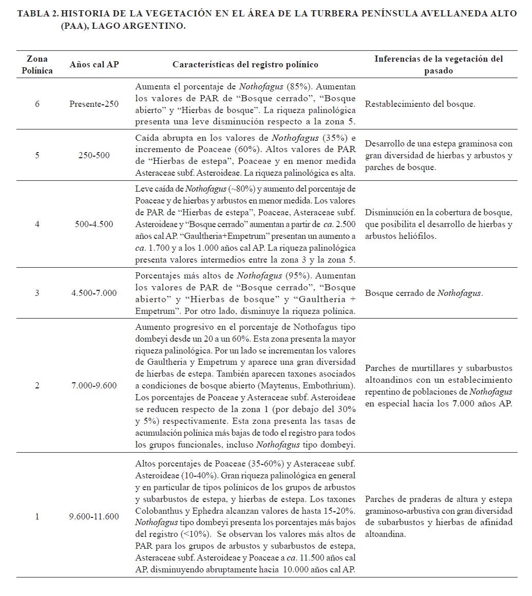 Este trabajo tiene como objetivo reconstruir los cambios en la vegetación y en los patrones de diversidad vegetal durante los últimos ca. 12.000 años cal AP en relación con la dinámica posglacial, de disturbios naturales y antrópicos en la cuenca del lago Argentino. Para ello, en primer lugar se presenta un modelo de representación polínica actual del gradiente de vegetación altitudinal, y luego el análisis del registro polínico y de carbón vegetal sedimentario de una secuencia de turbera localizada en la península Avellaneda (Parque Nacional Los Glaciares, Santa Cruz). Las inferencias paleoambientales a partir de este sitio son discutidas en el contexto de otras reconstrucciones existentes para la cuenca del lago Argentino (Fig. 1).