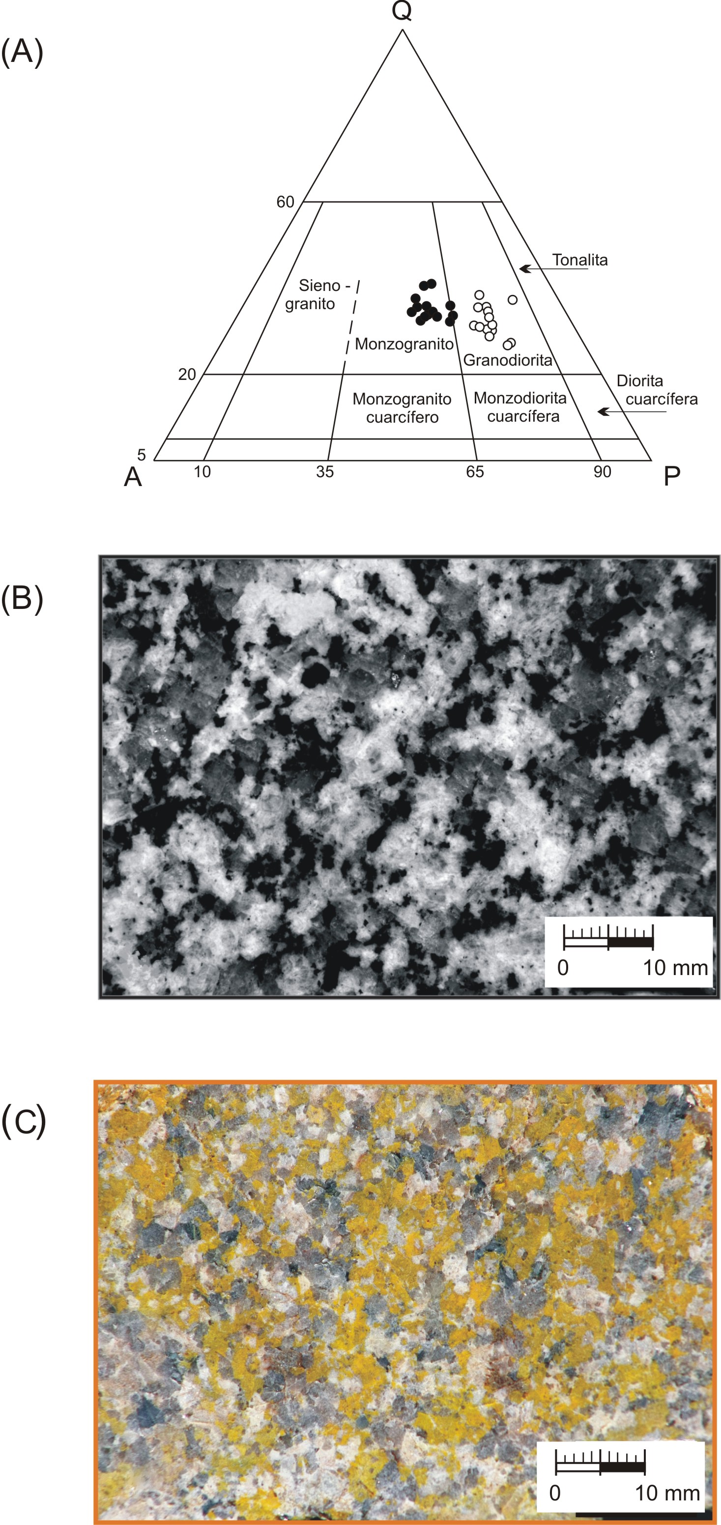 Fig. 2. A. Composición petrográfica de granodioritas y monzogranitos en diagrama QAP de Streckeisen (1974). Mineralogía según la norma C.I.P.W. B. Fotografía de una muestra granodiorítica del Plutón Pingo-Pingo, nótese la abundancia de biotita y anfíbola junto a cuarzo y plagioclasa. C. Fotografía de una muestra de monzogranito del Plutón Tilopozo en la que se ha teñido de amarillo el feldespato alcalino para destacar su abundancia.