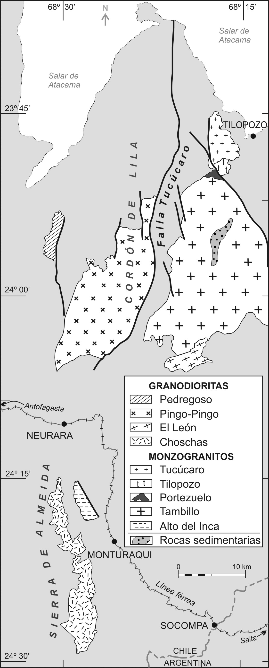 El batolito que constituye el Cordón de Lila y la Sierra de Almeida presenta extensos afloramientos que han permitido su estudio detallado. Las características petrográficas de cada uno de los diferentes plutones que lo componen están bien establecidas y sus relaciones de contacto mutuas y con su roca de caja son claras y definidas (Mpodozis et al., 1983; Niemeyer, 2013). Dentro del batolito cambro-ordovícico (490-460 Ma) se pueden distinguir dos litologías principales de rocas plutónicas: granodioritas y monzogranitos (Fig. 2). El objetivo de la presente nota es dar a conocer el carácter geoquímico de los plutones que conforman dicho batolito, a la vez que sugerir ideas acerca de su origen.