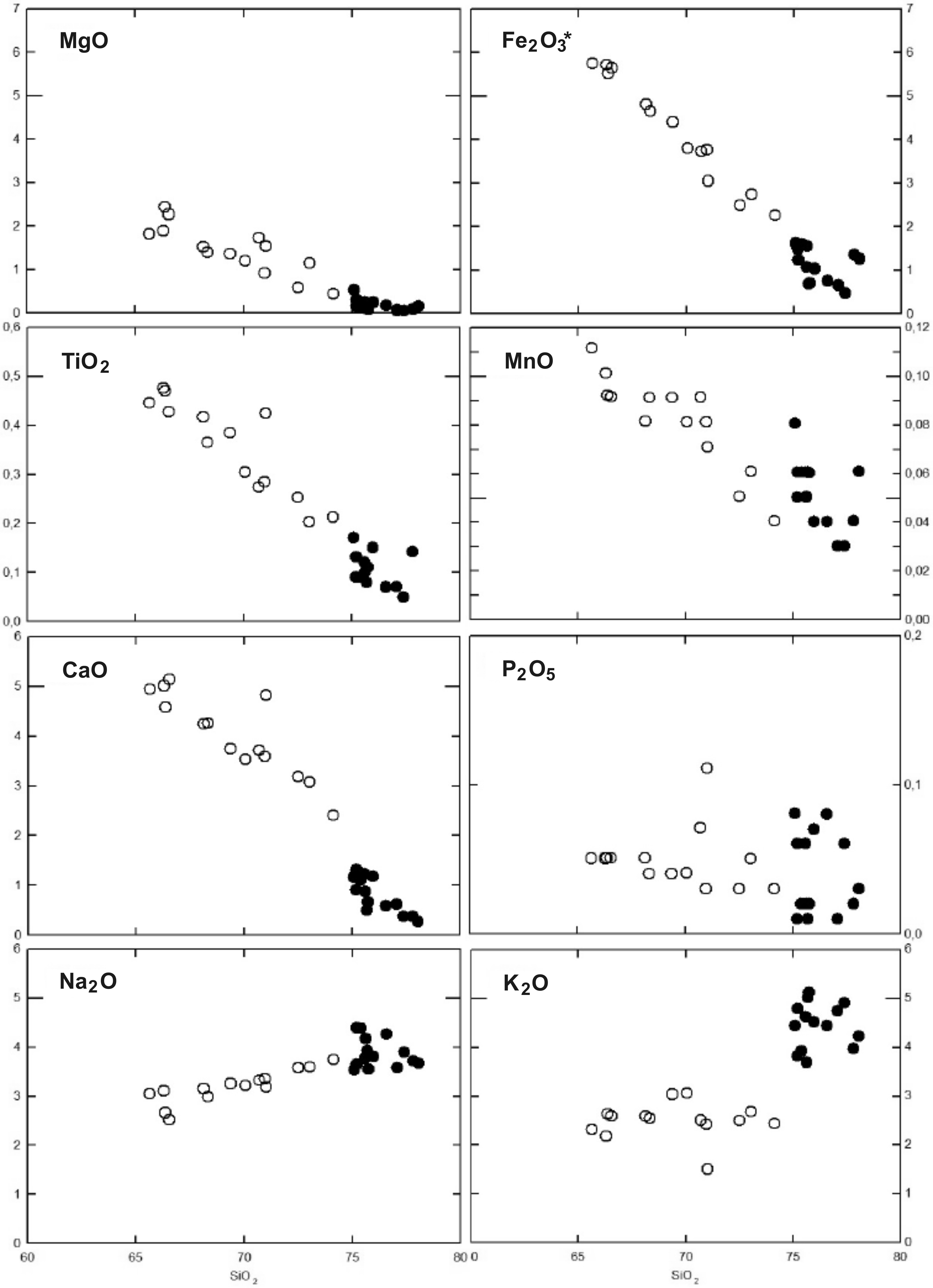 Fig. 4. Diagramas de Harker para elementos mayores de granodioritas (círculos vacíos) y de monzogranitos (círculos llenos), contenidos en peso%.