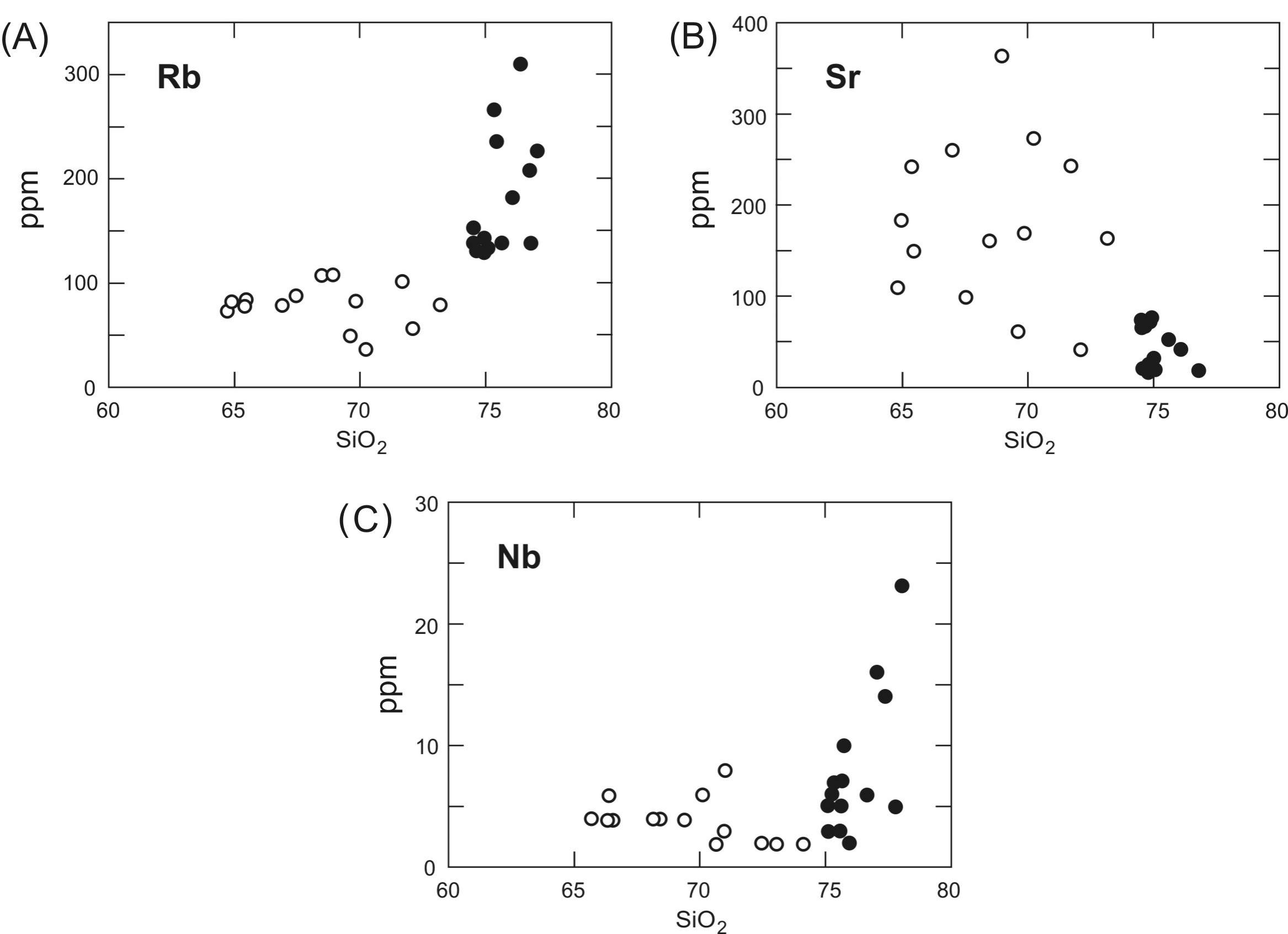 Se observa una diferencia notable entre los contenidos de los elementos en trazas de ambas litologías. En la figura 6 se indican las variaciones de algunos de estos elementos versus el contenido en SiO2. El Rb se enriquece en forma hiperbólica con el incremento del contenido de SiO2, desde las granodioritas hacia los monzogranitos (Fig. 6). El Sr de las granodioritas tiene una amplia dispersión, pero de modo general muestra una tendencia descendente con el incremento del contenido de SiO2. Para los monzogranitos, el Sr desciende linealmente dentro de su estrecho contenido de sílice (Fig. 5). La distribución de Nb es ligeramente descendente con el incremento de SiO2 para las granodioritas, y en los monzogranitos asciende linealmente entre 1 y 24 ppm dentro de su estrecho rango del contenido de SiO2 (Fig. 6).