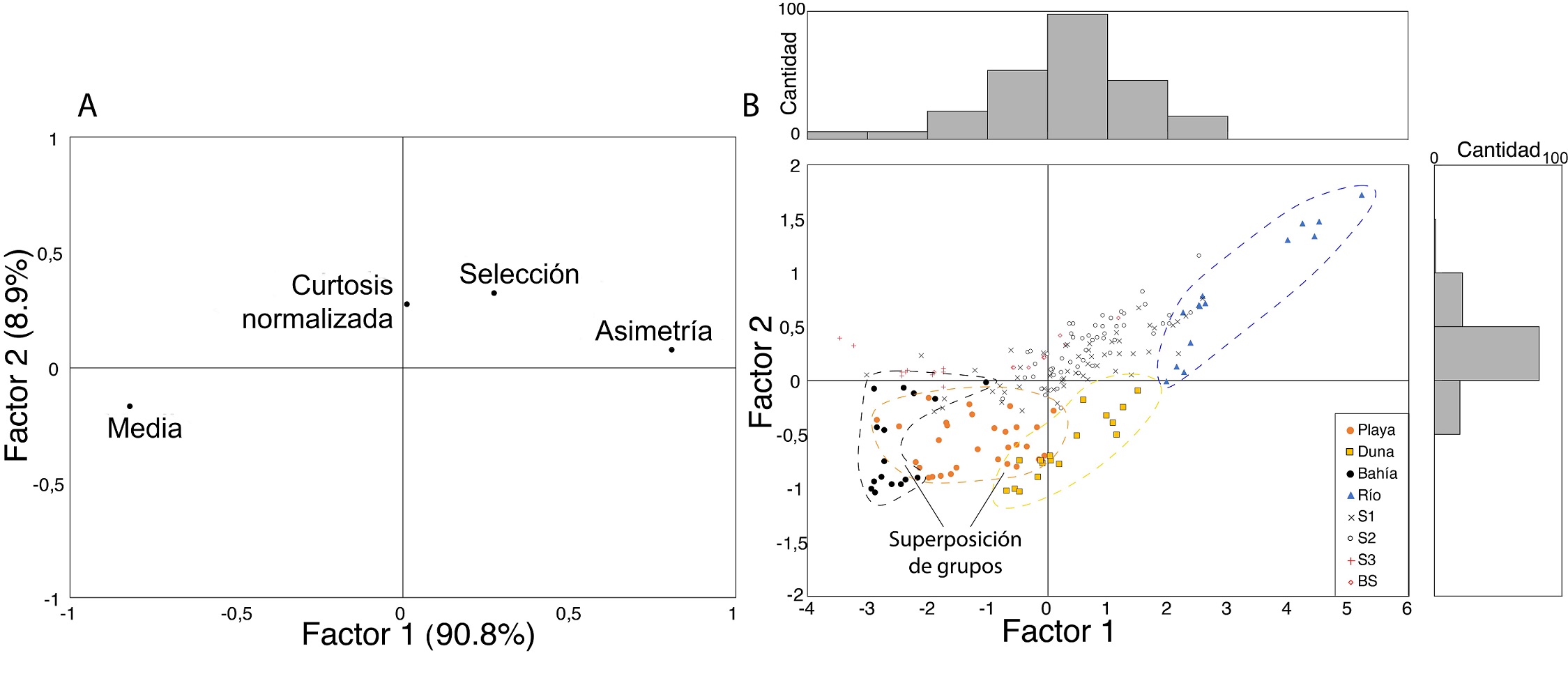 El análisis factorial muestra que el primer factor explica la mayor parte de la varianza (90,8%), mientras que el segundo casi la totalidad restante (8,9%). La media y la asimetría representan los pesos principales dentro del primero, la selección se distribuye en partes equitativas entre ambos factores, mientras que la curtosis normalizada solo tiene un peso menor dentro del segundo factor (Fig. 6A; peso de cada factor en la Tabla A1). Esto se condice con el grado de correlación entre los parámetros texturales obtenidos dentro de la matriz de correlación (Tabla A2). De acuerdo con esto, el primer factor es suficiente para diferenciar de forma clara los ambientes modernos, salvo para algunas muestras de bahía, playa y duna. Existe también un grupo de muestras de río que se alejan mucho de la distribución general de los datos. Salvo el caso de S3, que se diferencia notoriamente de las demás muestras de capas de arenas, el resto se agrupa de forma indistinguible más bien en el centro y primer cuadrante del gráfico de distribución de muestras del análisis de factores (Fig. 6B).