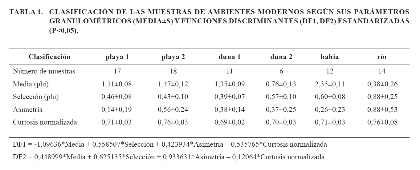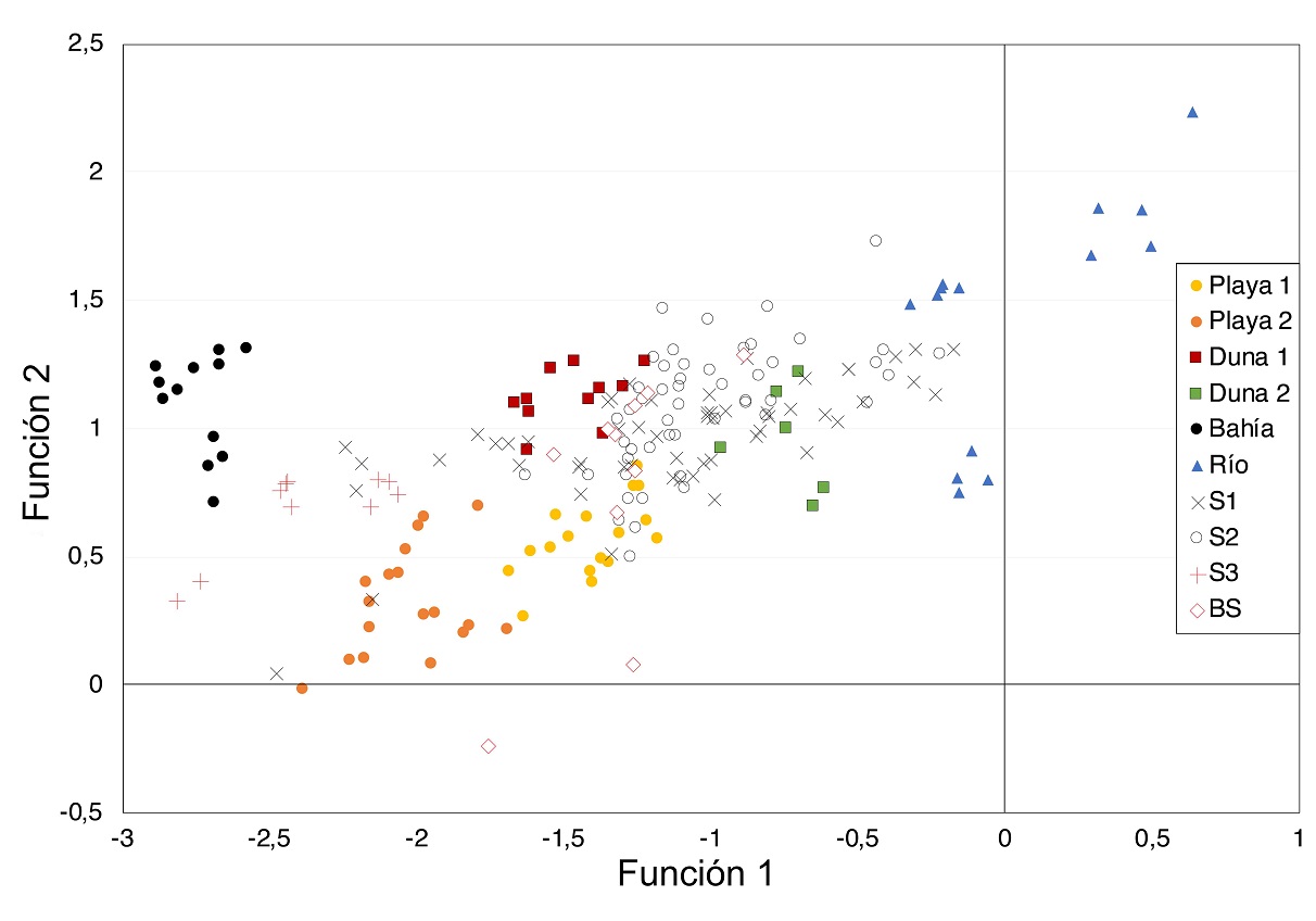 Tal como se evidencia en el análisis factorial, las muestras de los distintos tipos de ambientes presentan una diferenciación clara, sobre todo en la media, la asimetría y la selección en menor grado, de los cuales el grupo formado entre muestras de playa y duna es el más mezclado y disperso. De esta forma es posible realizar una distinción entre 2 poblaciones distintas de cada uno de dichos grupos (separados como playa 1, playa 2, duna 1 y duna 2). El análisis discriminante, con base en los parámetros granulométricos, calcula 2 funciones capaces de explicar la variabilidad de los datos originales (Tabla 1). Estas son capaces de clasificar el 100% de las muestras de ambientes modernos en uno de los 6 grupos resultantes de manera estadísticamente significativa (Tabla 1: bahía, río, playa 1, playa 2, duna 1 y duna 2). Al ingresar los datos de las distintas capas de arena al modelo discriminante así generado se puede observar que S1, S2 y BS son clasificadas como playa o duna, y S3 se divide entre bahía y playa (Fig. 7; información detallada de las muestras en Apéndice A6 y Tabla A3).