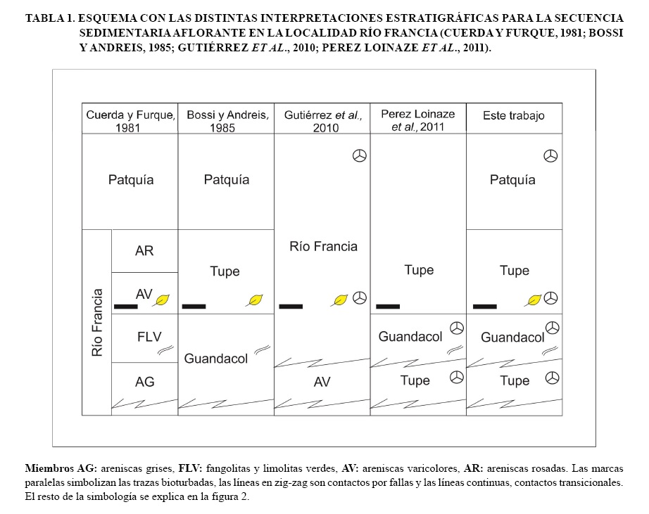 Una sensible modificación en la estratigrafía de la localidad Río Francia fue propuesta por Gutiérrez et al. (2010). Si bien estos autores continuaron el esquema de Cuerda y Furque (1981) al definir 2 unidades: formaciones Río Francia y Patquía, descartaron por primera vez el Miembro Areniscas Grises como la base de la Formación Río Francia (Tabla 1), por considerarlo una repetición parcial por falla del Miembro Areniscas Varicolores en el sentido de Cuerda y Furque (1981). Además, estos autores documentaron una edad pérmica para el sector superior (=Formación Patquía) en esta localidad, a partir de su contenido palinológico, aunque no agregaron detalles sobre las facies sedimentarias de los niveles superiores.