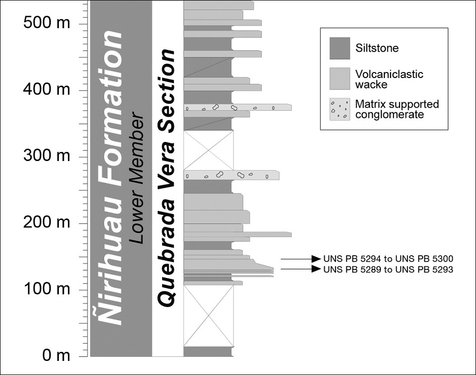 The Ñirihuau Formation is a lithostratigraphic unit comprising clastic and pyroclastic sedimentary rocks, with scarce participation of carbonates (e.g., Cazau, 1972; Cazau et al., 1989; Spalletti, 1981; Paredes et al., 2009), that are interpreted as deposited in fluvial and lacustrine environments (Santonja et al., 2021 and references therein). The material herein studied comes from the sedimentary lower member of this unit.