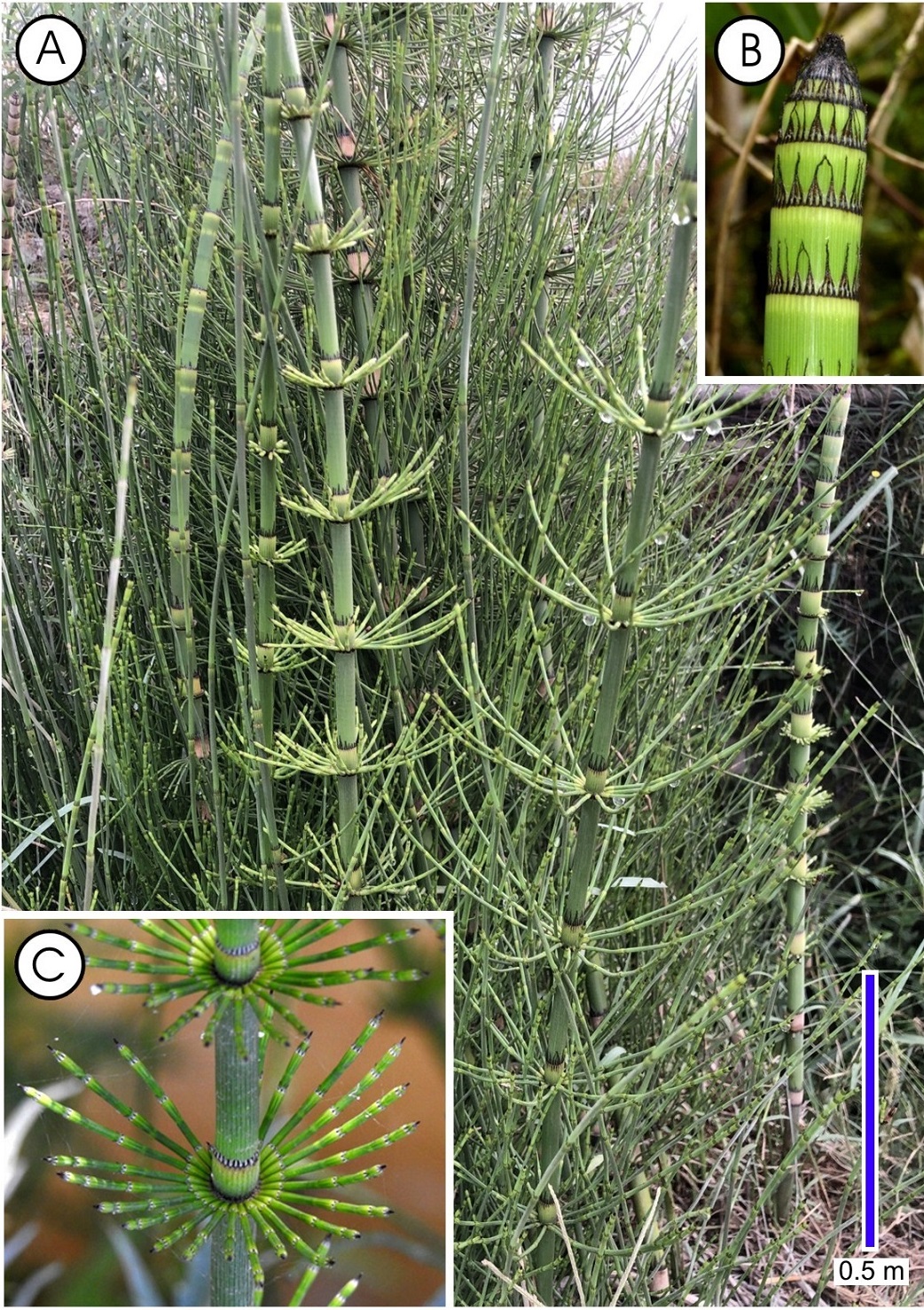 Representatives of the genus Equisetum are the only living members of the once abundant, diverse, and worldwide distributed group of vascular plants, the Equisetales. These ancient and morphologically distinctive free-sporing plants have a long geologic history that can be traced from the Devonian to the recent (Taylor et al., 2009). Living Equisetum species, commonly known as horsetails, grow naturally throughout much of the world; although they are absent in Australia, New Zealand, Antarctica, and islands of the Central Pacific, Indian, and South Atlantic oceans (Schaffner, 1930). Most of the 18 living species are distributed in the Northern Hemisphere and four species grow naturally in South America (Christenhusz et al., 2019).