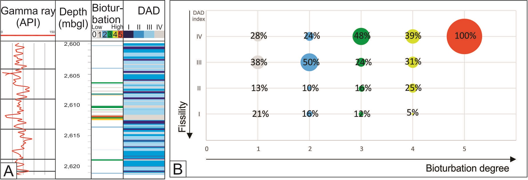 FIG 12. Fissility (DAD index) vs bioturbation degree (Lazar et al., 2015). A. Detail from figure 10 displaying the strong relationship between highly bioturbated intervals (bioturbation index over 3) and massive rocks (DAD=IV). B. Percentage of bioturbation degree (1 to 5) for each DAD fissility index (I to IV). Note that most of the rocks correspond to relatively massive (DAD=III) to massive mudstones (DAD=IV), especially from bioturbation degree 3. Depth in meters below ground level (mbgl). The bioturbation index was extracted from Otharán (2020) and Otharán et al. (2022).