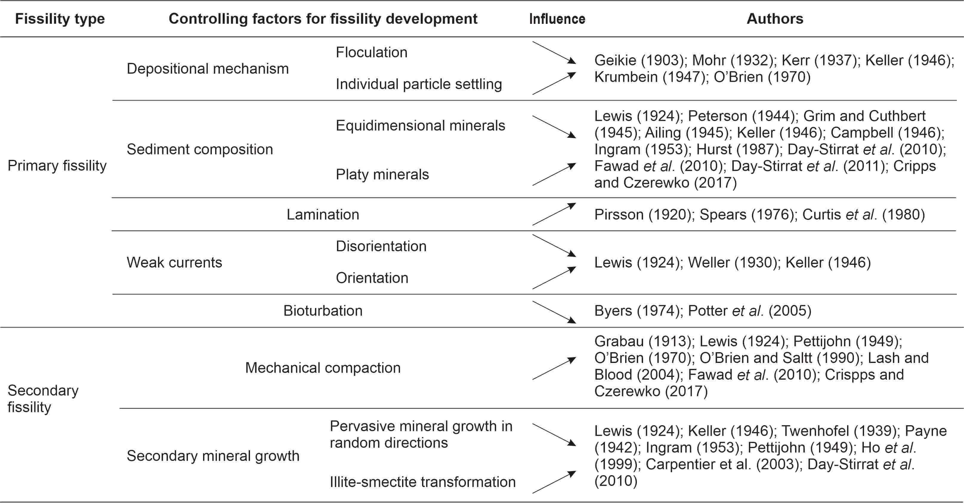 Numerous factors can be involved in fissility development (Table 1). These are separated into (i) those processes or conditions governing at the moment of sediment deposition, linked with the sedimentary environment, such as the depositional mechanisms and sediment composition, and (ii) those developed after mud deposition, such as bioturbation, and during diagenesis such as mechanical compaction, mineral alteration and secondary minerals growth. According to Lewis (1924) in the first case, the fissility would be primary (associated with depositional factors), whereas in the second case, the fissility would be secondary (associated with post-depositional processes).