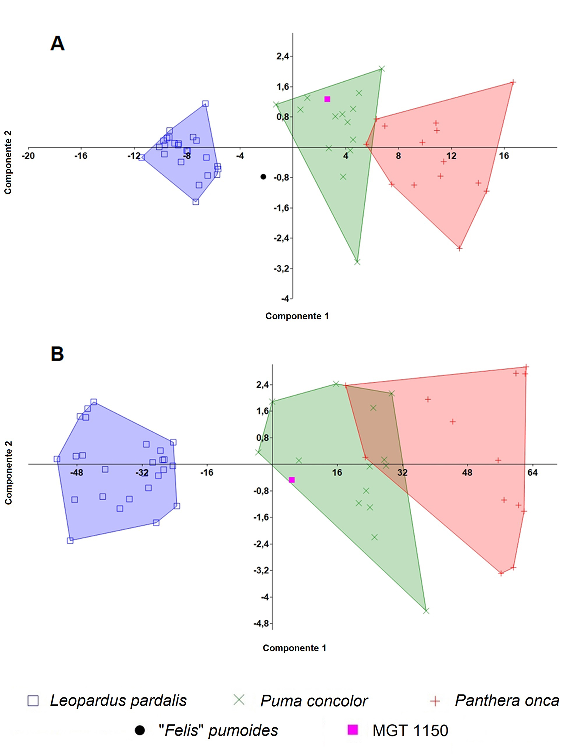 Análisis estadístico multivariado de componentes principales. Para el cráneo, el primer componente del análisis explica casi el 97% de la varianza de la muestra. Al graficar los valores de los dos primeros componentes el material MGT 1150 queda claramente dentro de la distribución de Puma concolor (Fig. 3A). Los coeficientes de carga del primer componente muestran que la variable que más influye es el diámetro anteroposterior del cuarto premolar superior, aunque cabe puntualizar que el aporte de las demás componentes es muy significativo, destacándose entre estos el diámetro anteroposterior del canino superior (Apéndice 4).