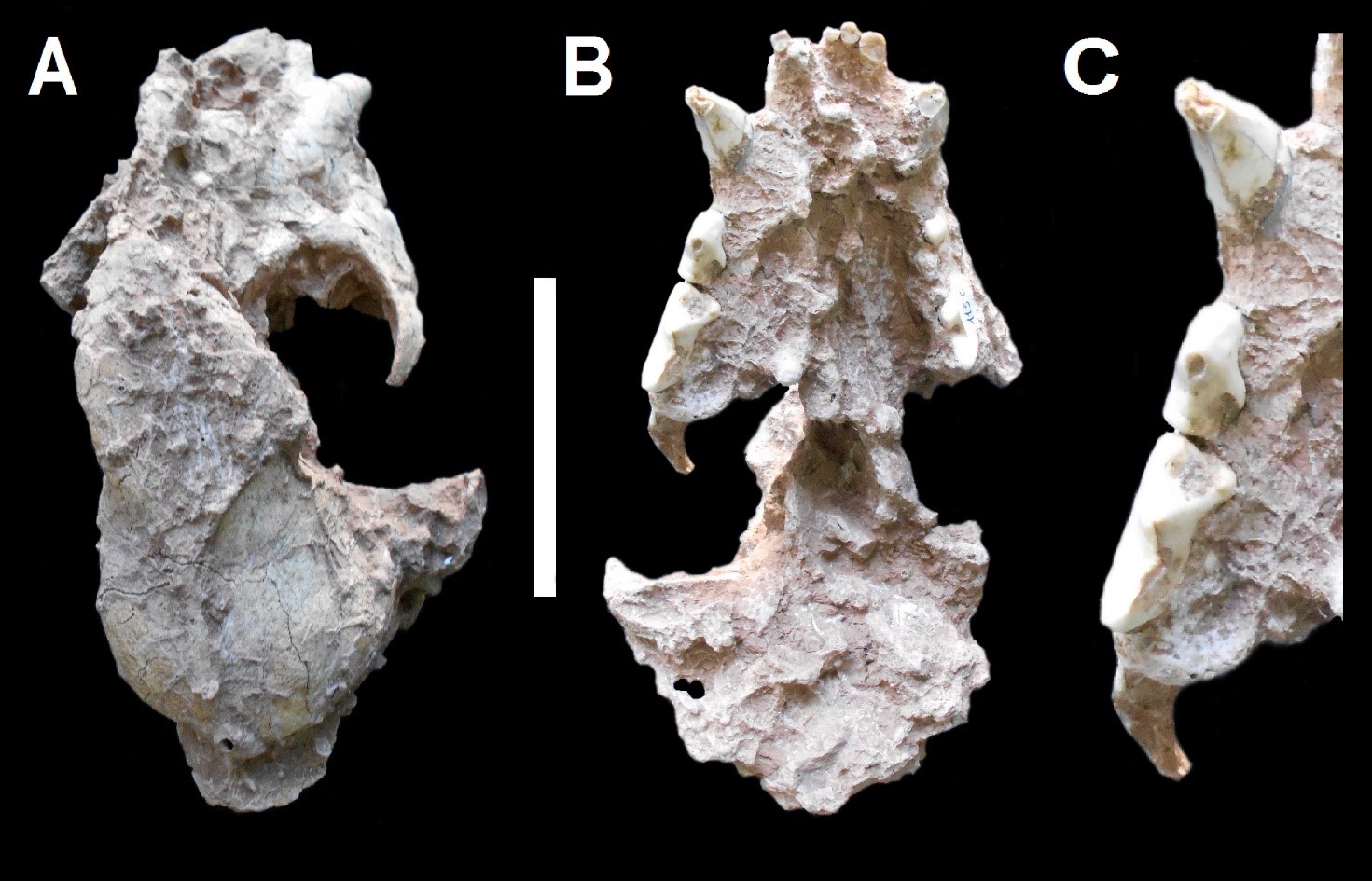 MGT 1150, cráneo en vista A) dorsal, B) ventral, y C) detalle de la dentición superior. Escala 10 cm.