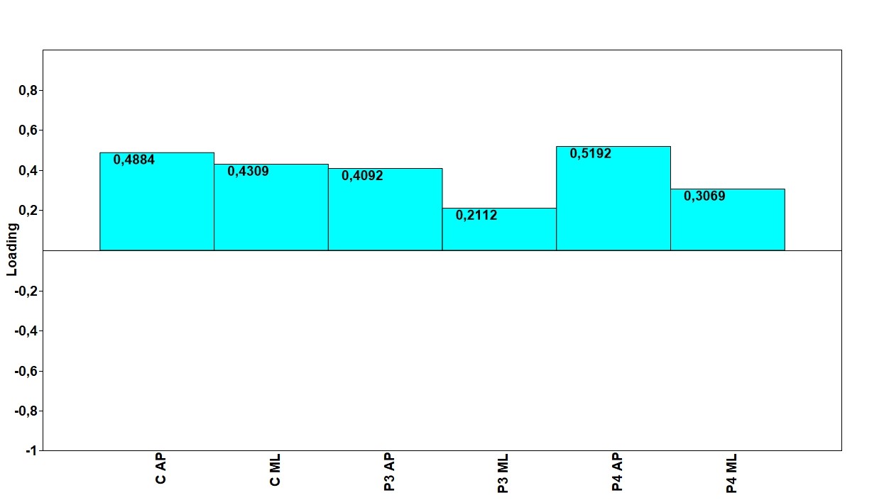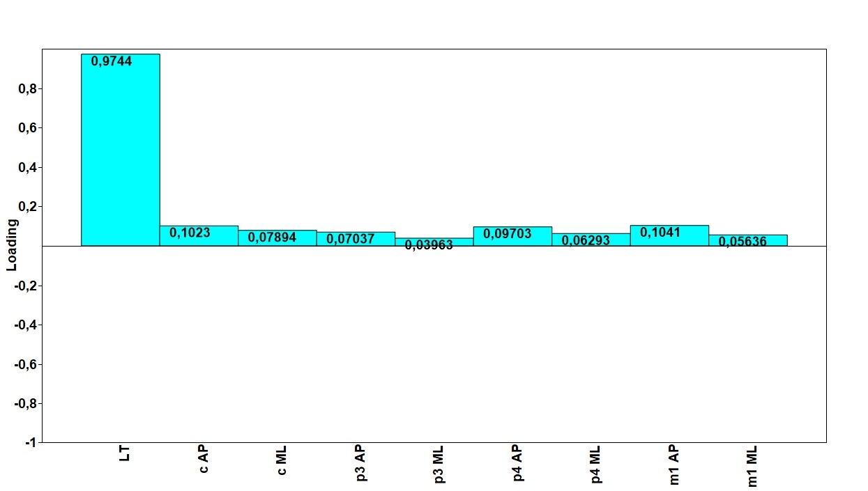 Gráfico de coeficientes de carga del componente principal 1, para todas las variables. |