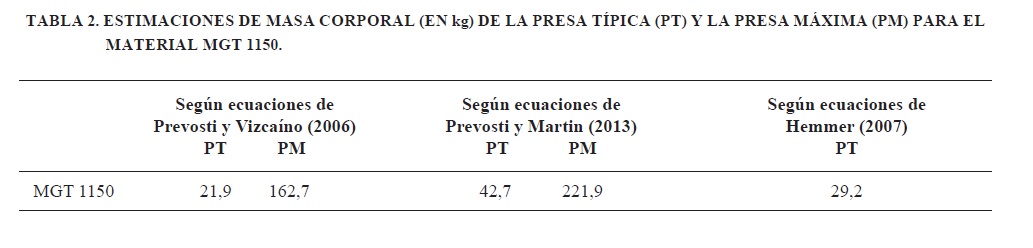 Masa corporal. Las estimaciones de masa corporal, según ecuaciones alométricas desarrolladas para félidos actuales, dan un resultado promedio de 45,3 kg (rango de masa de 43,6-47 kg), lo que es coherente con la masa conocida para P. concolor, en particular para ejemplares hembra de la especie (Currier, 1983; Botero-Cruz et al., 2018). Por otro lado, la masa corporal de la presa potencial está entre 21-42 kg, mientras el tamaño extremo estimado de la presa máxima supera los 200 kg (Tabla 2).
