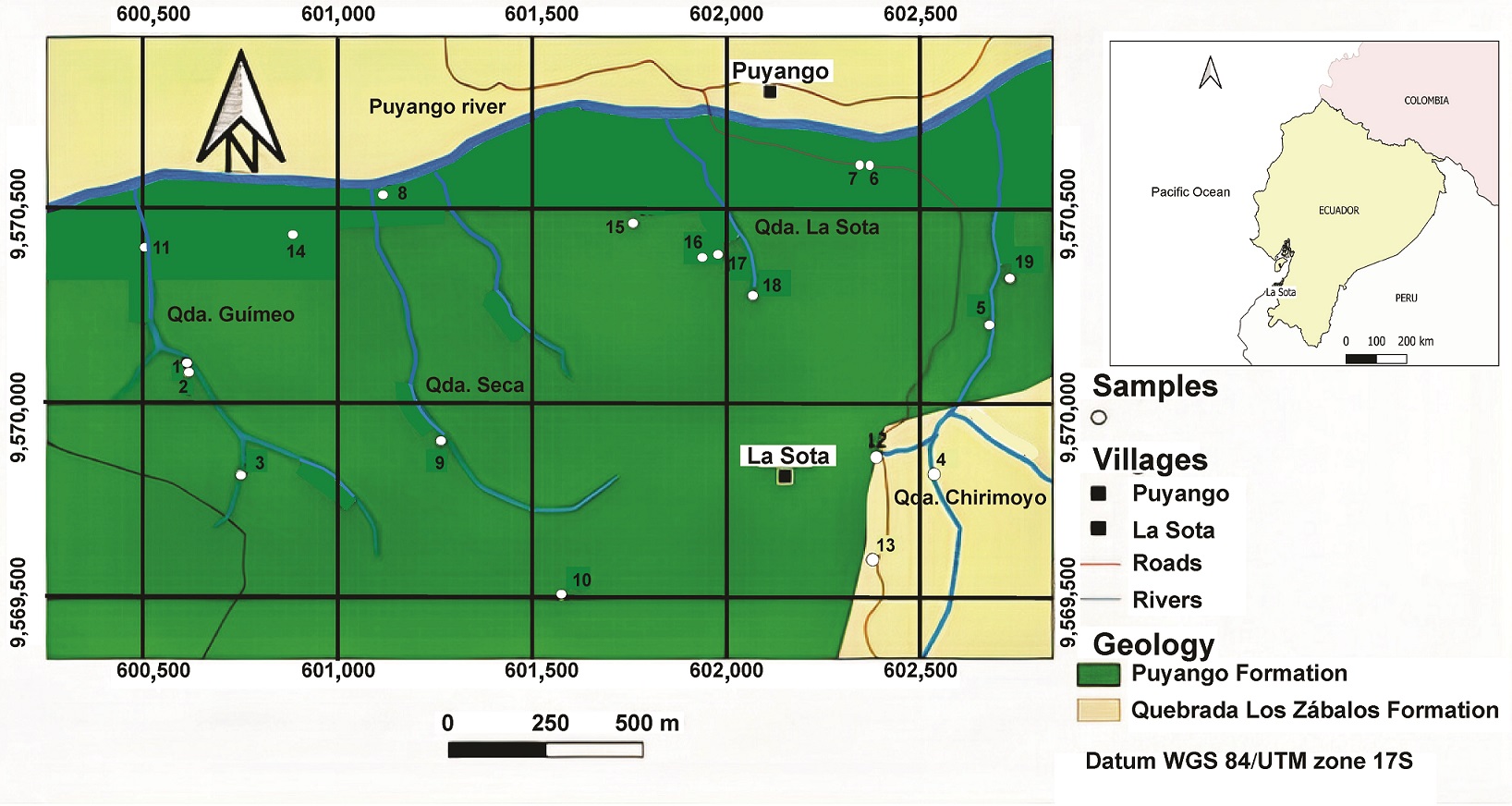 The study area is located in the locality of La Sota (Loja province) in the southwestern of Ecuador (Fig. 1). It is characterized by an irregular topography, with abundant vegetation and steep slopes. This area has a dry mega-thermal tropical climate with and average temperature of 24 °C, which, added to the humidity, causes an increase in thermal sensation. The highest rainfall is registered in February, March and April (winter), whereas little or no rainfall occurs during the rest of the year (summer) (G.A.D.M. de Puyango, 2014)2.