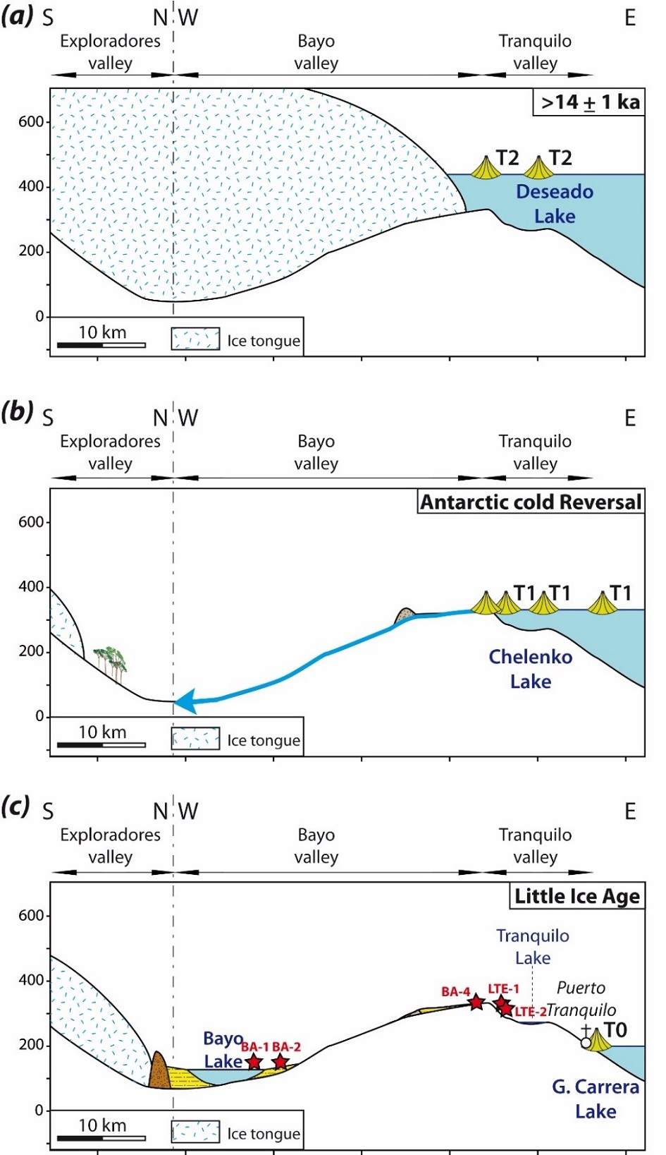 Figure 8 shows a conceptual model of the evolution of glacial cover in the BRV. Initially, the valley was covered by the glacier that dammed the outlet of Deseado Lake (Fig. 8A). During this stage, the T2 terraces observed all around the GCBAL (Martinod et al., 2016) formed. They correlate with the alluvial level Al2 identified in the Bayo Pass. After the glacier retreated from the BRV, the valley was able to drain the lake, thus lowering its level. When the level stabilized, Chelenko Lake was formed (Fig. 8B). During the Chelenko stage, the T1 terraces formed all around the lake. They correlate with the alluvial level Al1 identified in the Tranquilo Valley. The lake abandoned the Tranquilo Valley following the opening of the Baker River Valley (Fig. 8C). Different authors describe the formation of this large lake connecting the GCBAL and Cochrane-Pueyrredón Lakes, whose level stabilizes around 350 m a.s.l. before the opening of the Baker River Valley (Turner et al., 2005; Bell, 2008; Glasser et al., 2016; Hein et al., 2010; Martinod et al., 2016; Thorndycraft et al., 2019; Isla and Espinosa, 2021).