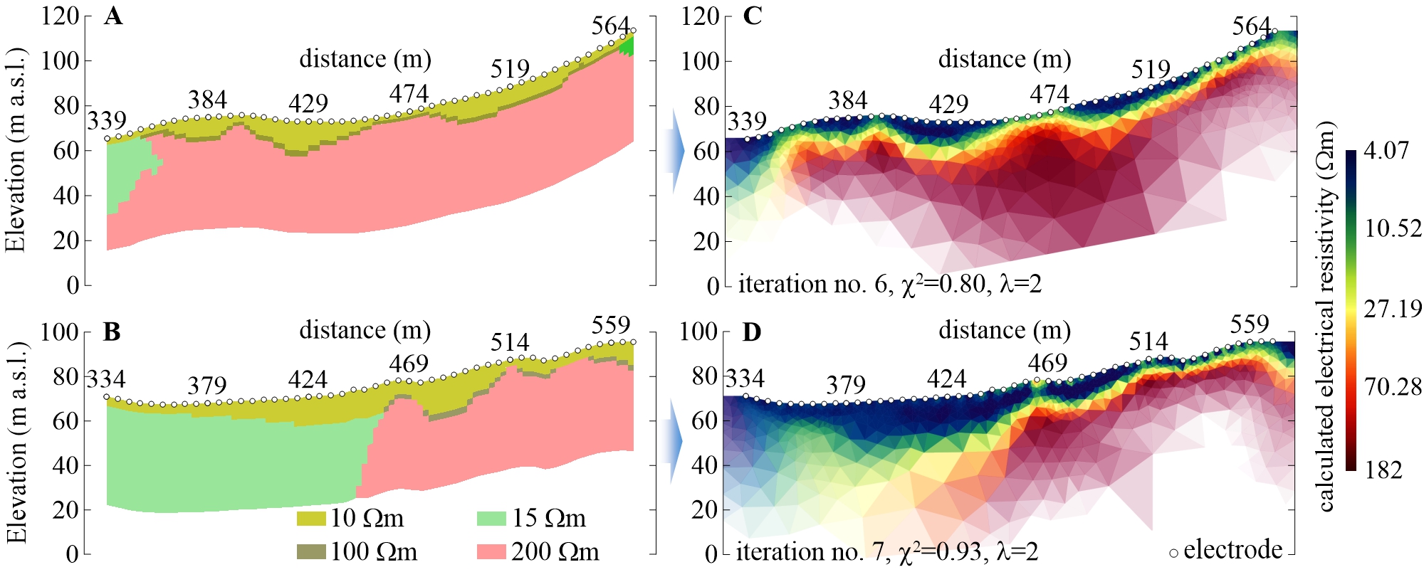 The same inversion process behind figure 3 was followed to develop the synthetic model by establishing the same number of electrodes and parameters. Hence, two 2D electrical tomographies were created (Fig. 5).