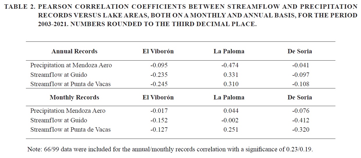 The hydroclimatic variables considered in this study were (1) the streamflow of the Mendoza River, and (2) the precipitation in the Mendoza Aero meteorological station (Fig. 2), both on an annual and monthly basis. To correlate these two variables with the lake area data for the last two decades, the Pearson correlation coefficient was used.