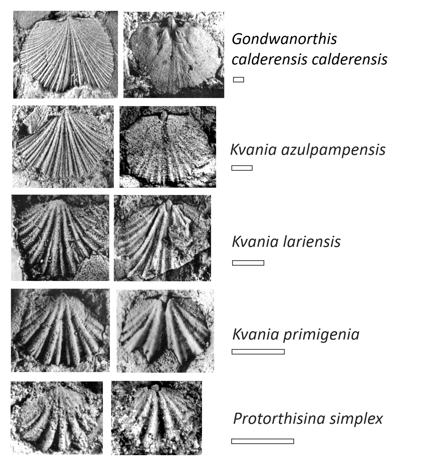 Concerning the Furongian species K. primigenia, a generic assignement is difficult since it exhibits intermediate features between the inferred ancestor Protorthisina simplex and its descendent Kvania lariensis. K primigenia differs from P. simplex mainly in the branching of primary ribs near the mid-valve length and, internally, in its proportionally larger septalium not supported by a septum. Originally, the author questionably referred the type material to Kvania because of its fascicostellate ornament rather than simple ribbing, and the fact that in adult specimens the brachiophore bases converge onto the valve floor forming a notothyrial chamber (Benedetto 2007b, p. 277). However, since a true septalium is absent (excepting in some juvenile specimens) and a well-defined subtriangular to subrectangular notothyrial chamber (considered a diagnostic feature of Kvania) is always present, the species primigenia is herein assigned to Kvania without interrogation.