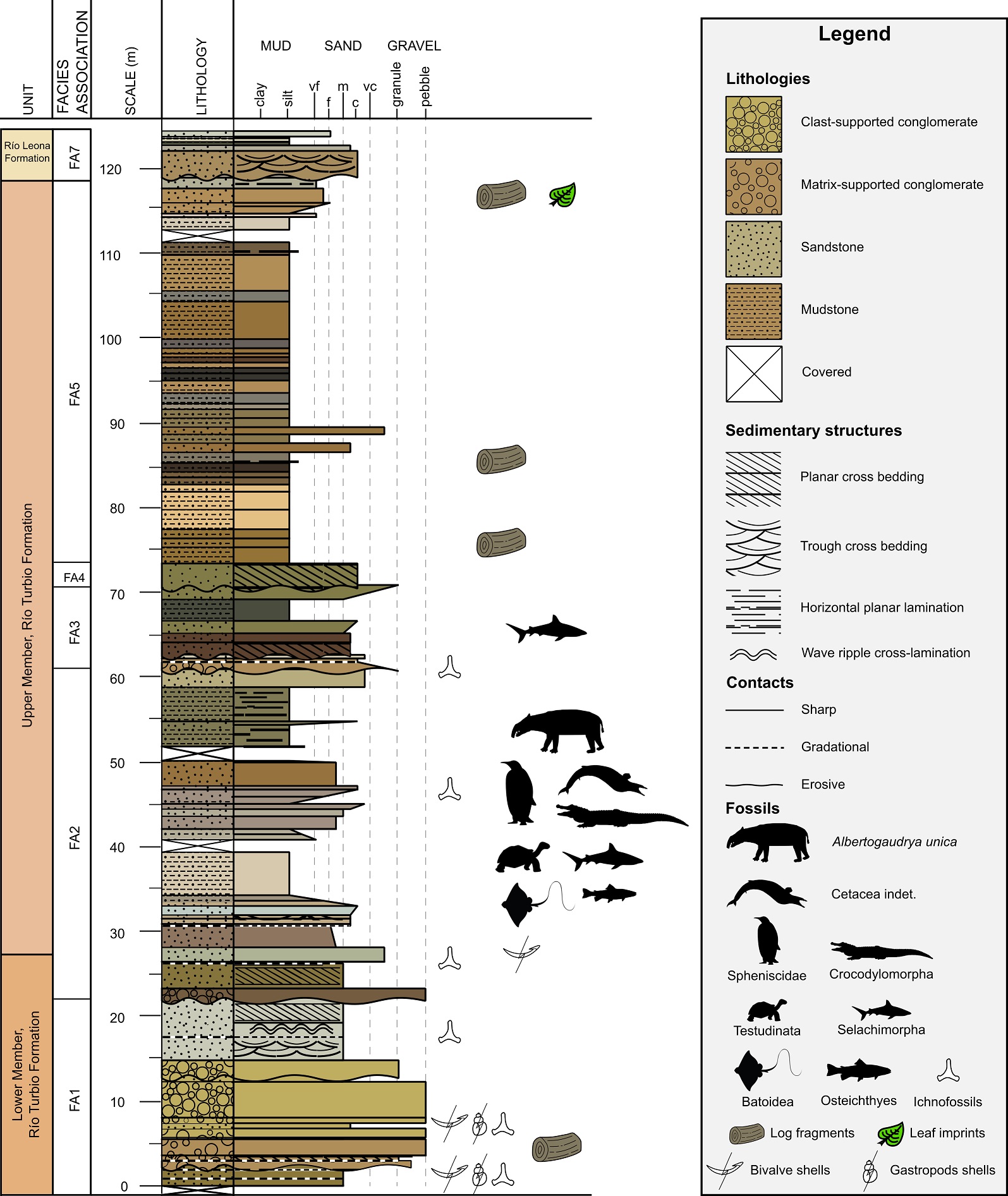 Fossiliferous exposures in Sierra Baguales occur in abrupt cliffs and gullies, interrupted by flat morphologies and ledges, that create deflation planes, where abundant surface-exposed vertebrate fossils are found. The fossil material here described was collected at Loma Tiburón Locality 2 (50°43’41” S; 72°28’17” W), one of these active erosive surfaces forming a north-oriented valley that widens to the northeast, generating a slightly inclined plane, following the dip of the regional monocline (Fig. 2A, B). The erosional nature of this surface limits the precise placement of the tooth in the local stratigraphic scheme. However, the approximate stratigraphic position was constrained by direct correlation with two fossiliferous sections immediately north and south of Loma Tiburón Locality 2; the Chorrillo Jabón (50°42’32’’ S; 72°28’28” W) and El Encierro (50°44’6” S; 72°28’24” W) stratigraphic logs (Fig. 2B). In Chorrillo Jabón, sixteen lithofacies were described and grouped into eight facies associations (FA1-8; Alarcón, 2020), interpreted as marginal-marine gravel bars and sandbars (FA1 and FA4), tidal channels (FA3 and FA6) and creeks (FA2), intertidal flats (FA5), fluvial braided deposits alternating with overbank fines (FA7) and foreshore deposits (FA8), originated on a mainly tide-dominated estuary (Alarcón, 2020; Alarcón et al., 2022, 2023). Fossil vertebrates were collected in the central portion of the succession, exclusively from massive, fine-grained sandstones and siltstones, grading to medium-grained heterolithic sandstones with subordinated cross-bedded sandstones to the top, with a maximum thickness of 32 m (Fig. 3). These beds were interpreted as tidal channels and creeks of the FA2 and FA3 (Alarcón, 2020; Alarcón et al., 2022; Bostelmann et al., 2022). The associated fossil content includes a diverse array of chondrichthyans, consisting of thousands isolated shark and ray teeth assigned to 19 species (Otero et al., 2013); incomplete plates and postcranial fragments of large sized Testudines; and teeth and steoderms assigned to Mesoeucrocodylia indet. (Otero et al., 2012). In nearby localities, FA’s 2 and 3 also bear bony fish scale agglomerates, disarticulated vertebrae, and bone fragments of at least two different species of Osteichthyes; incomplete bone remains of a large member of Sphenisciformes; and robust cetacean vertebral centra, among others (Bostelmann et al., 2022; Fig. 3). Biochronological constraints, based on the chondrichthyo-fauna from Loma Tiburón localities 1, 2, and Chorrillo Jabón, support a middle to late Eocene age (Bartonian-Priabonian) for the fossiliferous beds (Otero et al., 2013; Alarcón et al., 2022).